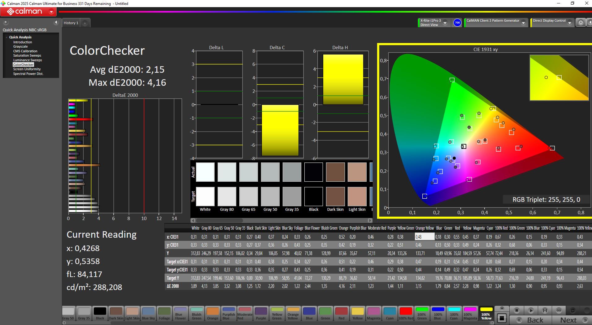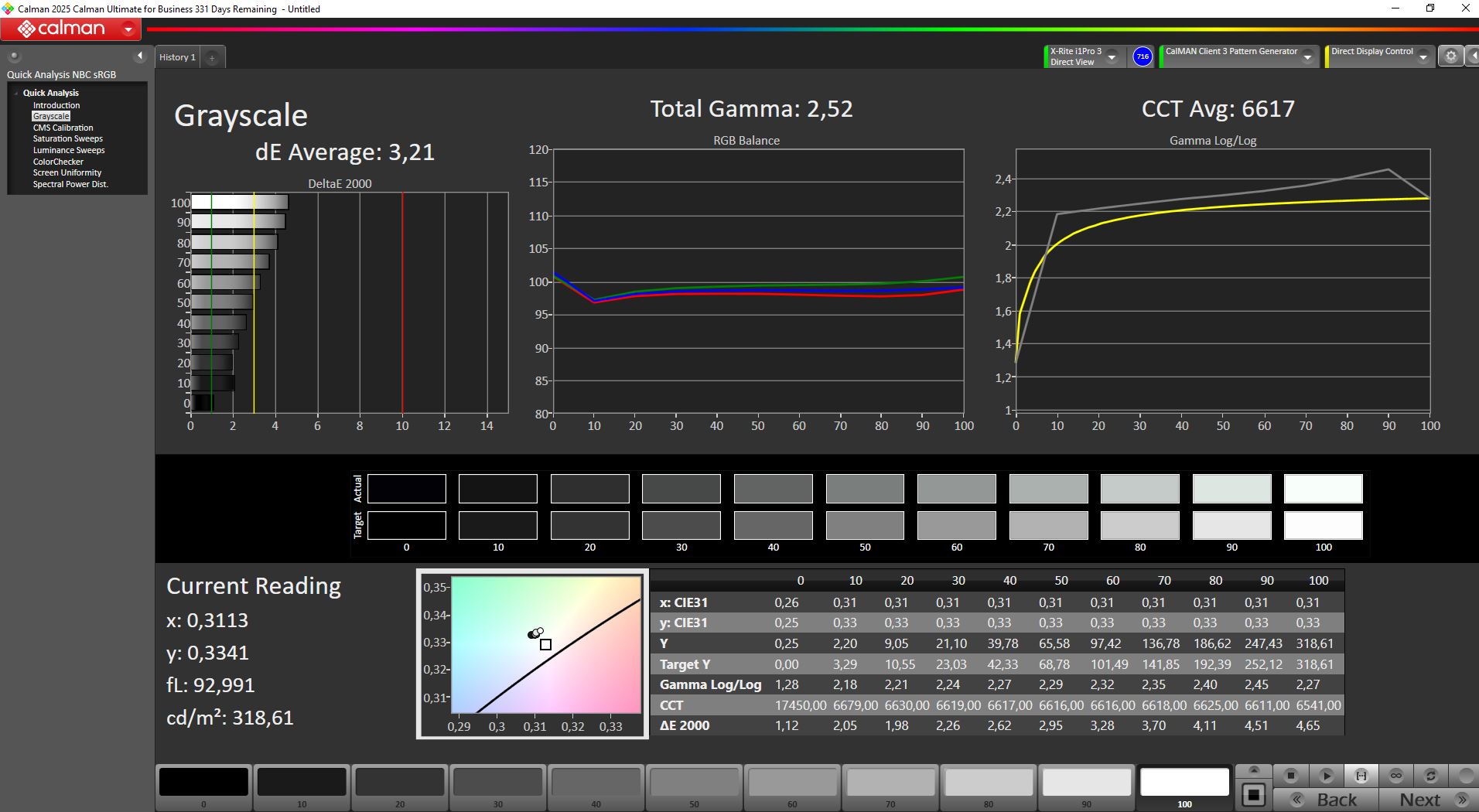 Out of the box, the display is reasonably well calibrated. After manual calibration, grayscale and color deviations were reduced further, reaching an average deltaE of around 1.3.