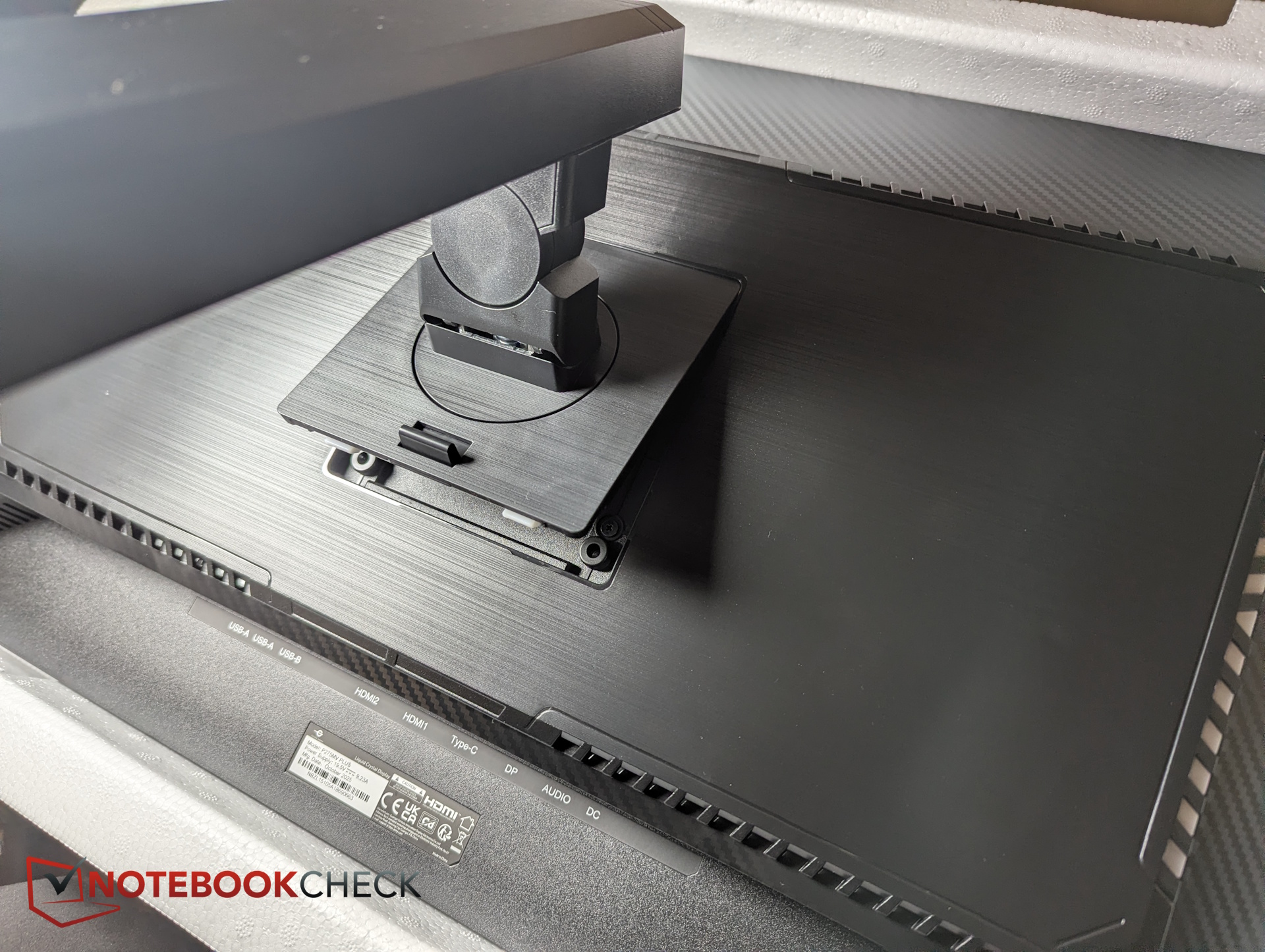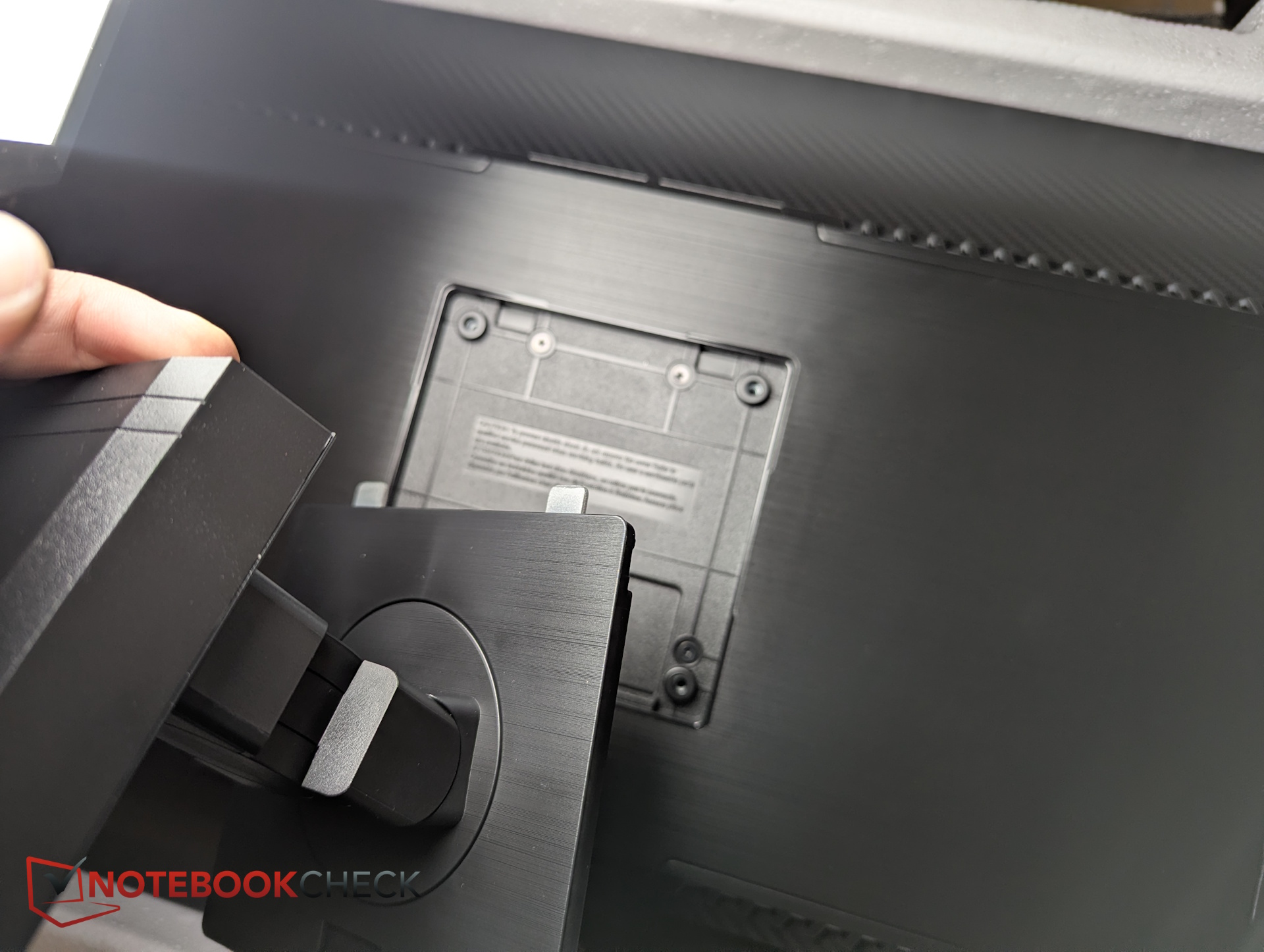 Assembly is straightforward. The stand clicks directly into the VESA mount on the back of the display—no screws required.
