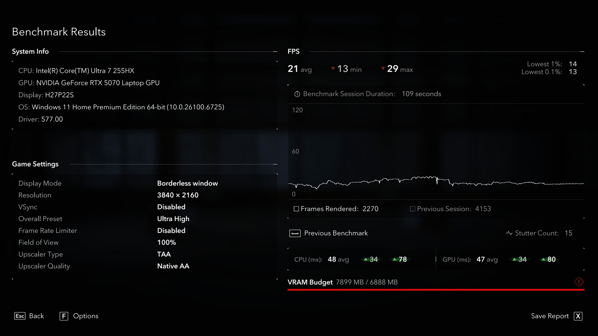 To stress the VRAM further, we switched to native 4K. Now, at least according to the indicator, VRAM demands exceed the limit by a fair margin — and we recorded a stutter count of 15. The problem here: we’re already down to an average of 21 fps at native 4K, which makes it hard to say whether the stuttering is really due to VRAM limits or simply the GPU struggling overall.