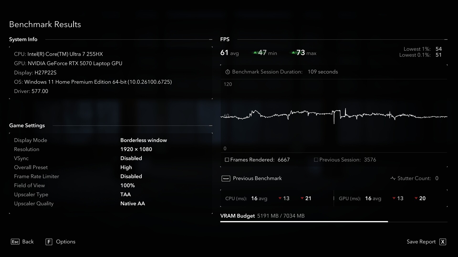 Switching from native 4K to DLSS Quality mode bumps the average back above 30 fps and drops the stutter count to 2 — again, despite the game still reporting a VRAM overage. In Full HD on High settings, the VRAM limit isn’t breached at all, the stutter count is 0, and performance averages 61 fps. In short, Assassin’s Creed Shadows isn’t the best test case for judging VRAM sufficiency, since performance constraints appear long before memory usage becomes a real issue. Therefore, it is also less of a problem.