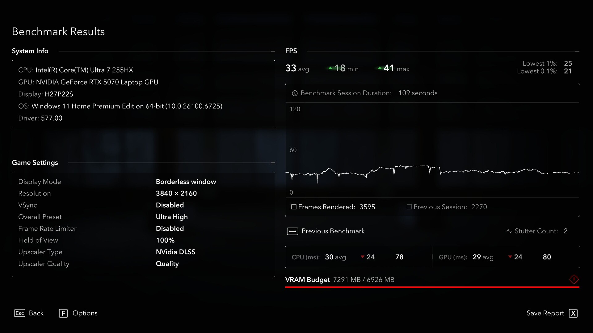 In Assassin’s Creed Shadows at 2,560 x 1,440 (QHD), the game reports that the VRAM budget is exceeded by about 100 MB. In the following benchmark, though, frame times remain steady — even if the average frame rate hovers around 38 fps. The internal stutter count registers at just 1.