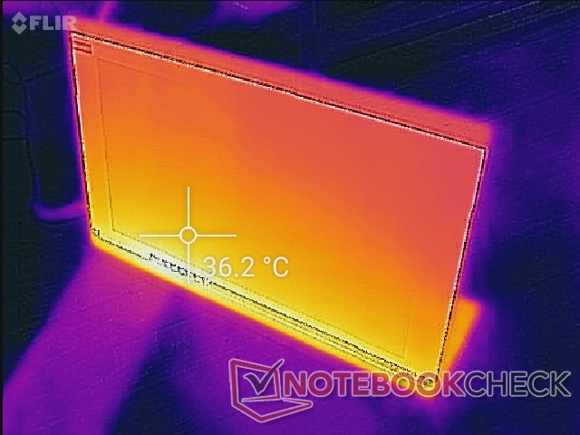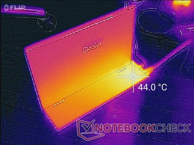 Surface temperatures can be quite warm at almost 45 C on the rear of the unit nearest the HDMI port as shown by our temperature map below. While noticeable when handling the BladeX like a tablet, we don't find the warm temperature to be an issue when the unit is on a desk.