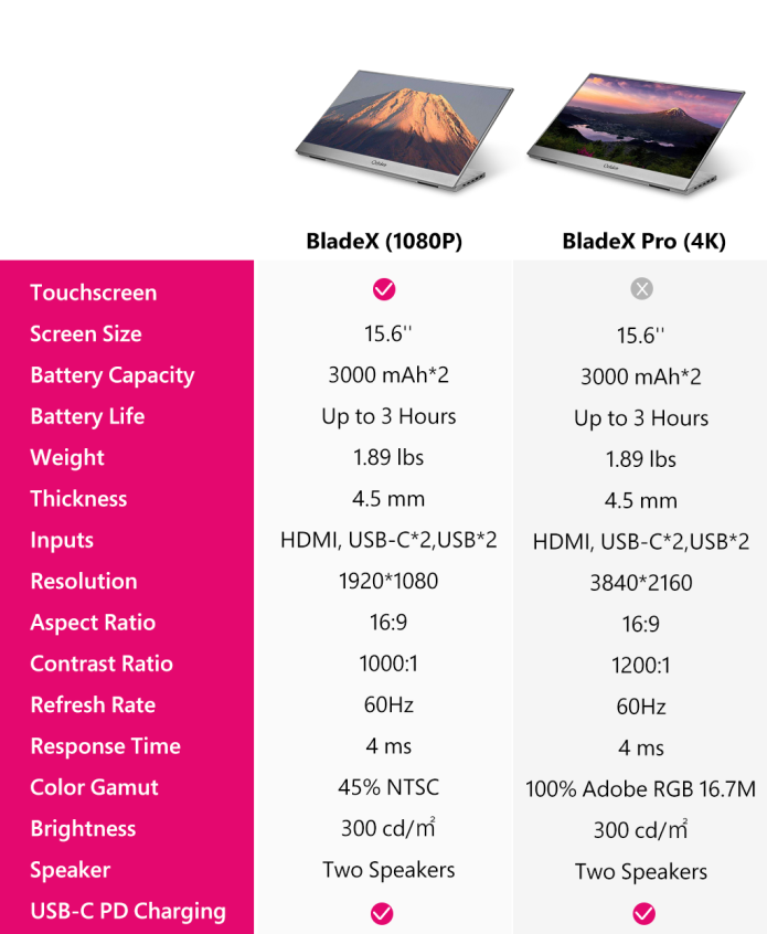 Odake plans to launch two main SKUs come November 2019: a 1920 x 1080 FHD touchscreen BladeX model and a 3840 x 2160 4K UHD non-touch BladeX Pro model. Connectivity and chassis features will otherwise be identical between both options. Early bird adopters can pre-purchase the BladeX and BladeX Pro before they launch for $180 and $280, respectively.