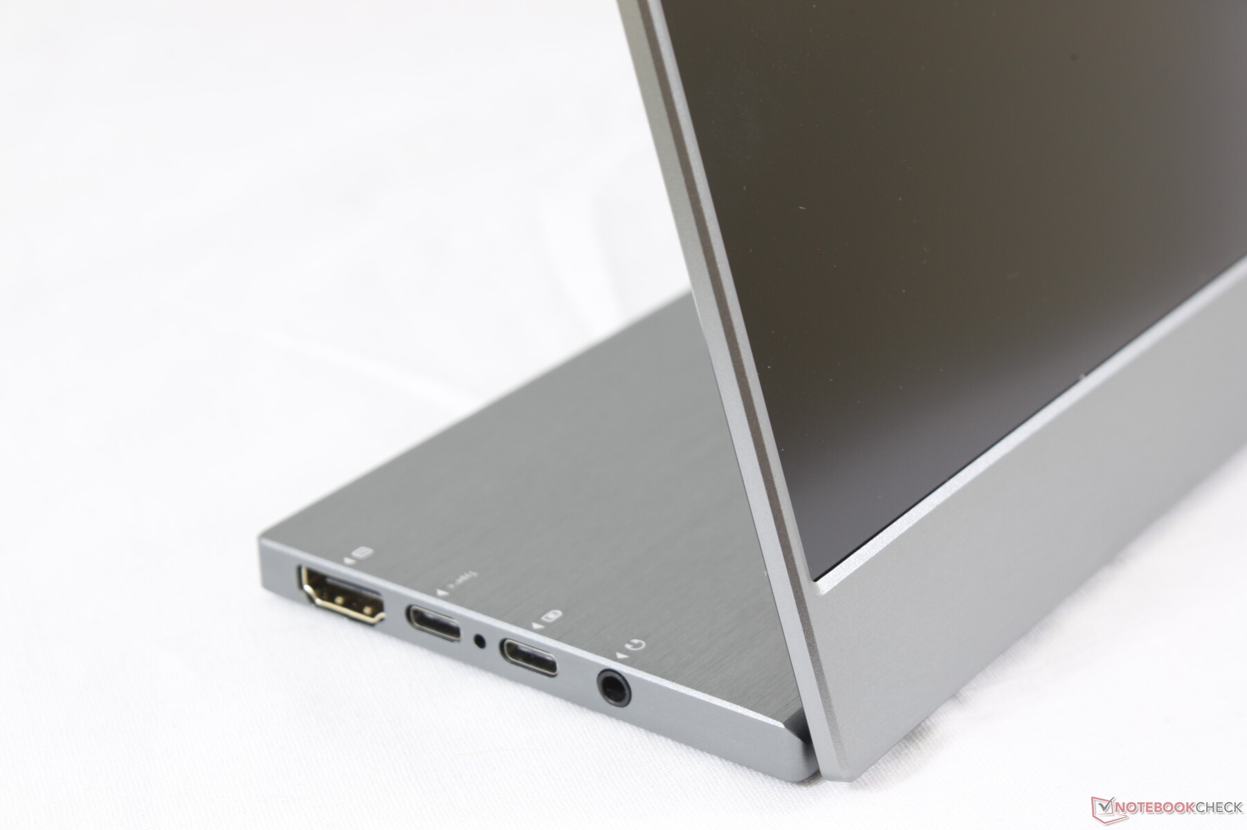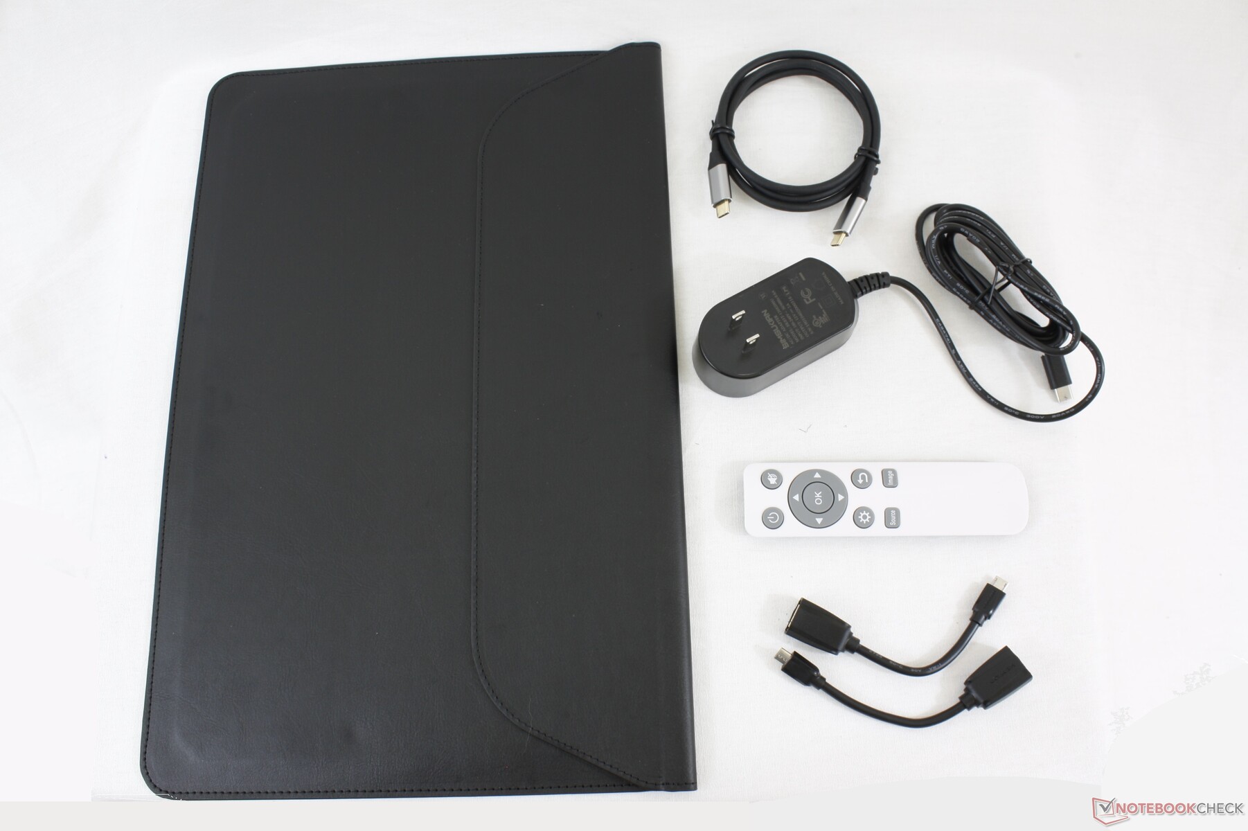 The box includes a host of extras like a USB Type-C to Type-C cable for video and data, HDMI cable (not shown), 2x Micro-USB to Type-A adapters, a faux leather case, and a small 24 W (12 V, 2 A) USB Type-C AC adapter. Note that this AC adapter can also be used to recharge other USB Type-C devices including smartphones and tablets. If we could ask for one more extra, then a velvet cleaning cloth would be appreciated since the display will inevitably collect smudges over time.