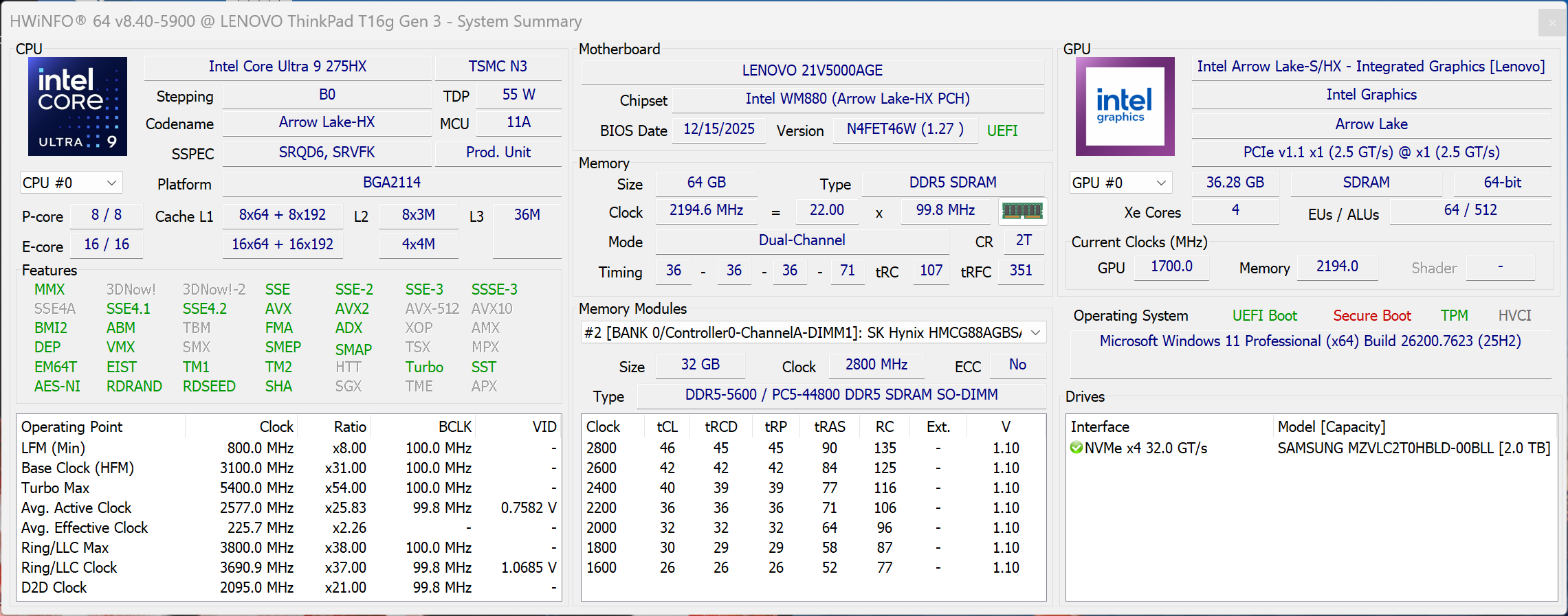 | Lenovo ThinkPad T16g Gen 3 RTX 5080 Intel Core Ultra 9 275HX ⎘ NVIDIA GeForce RTX 5080 Laptop ⎘ 64 GB Memory, 2048 GB SSD | Amazon: 1. Lenovo ThinkPad P16 Gen 3 (1... 2. Lenovo ThinkPad P16v Gen 3 M... 3. Lenovo ThinkPad E16 Gen 3 16... List Price: 4800€ | 2.6 kg | 29.8 mm | 16.00" 3200x2000 236 PPI OLED | |