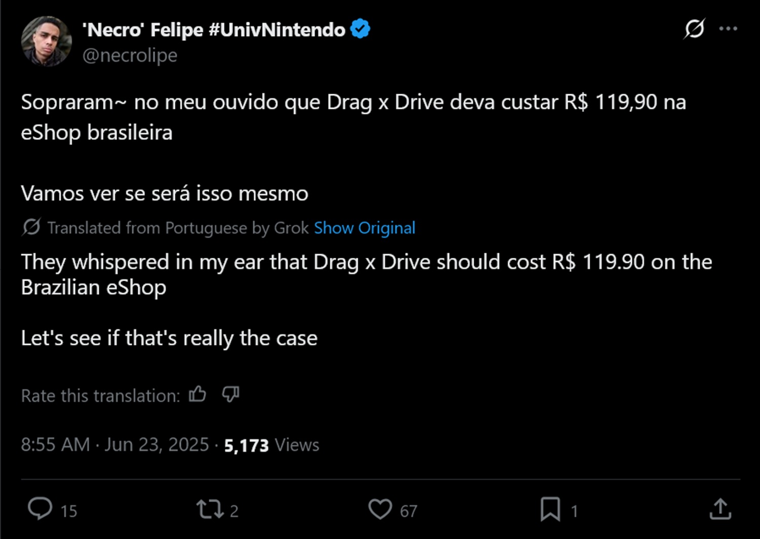 'Necro' Felipe received word of what Drag x Drive will cost on the Brazilian Nintendo eShop. He isn't guaranteeing the price point, but it has nonetheless caught the attention of gamers. The title is purely a digital release and will likely not use a cartridge in any region.
