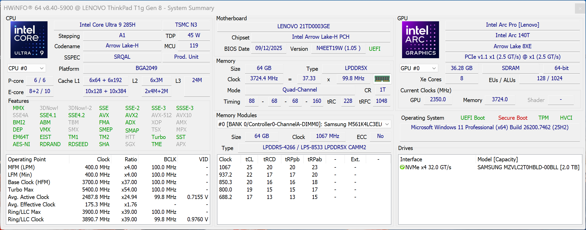 | Lenovo ThinkPad T1g Gen 8 21TD003GE Intel Core Ultra 9 285H ⎘ NVIDIA GeForce RTX 5070 Laptop ⎘ 64 GB Memory, 2048 GB SSD | Amazon: 1. $3,839.06 Lenovo ThinkPad T1g Gen 8 21... 2. $3,099.99 Lenovo ThinkPad P1 Gen 7 Wor... 3. $5,504.18 Lenovo ThinkPad T1g Gen 8 21... List Price: 4500€ | 1.9 kg | 15.8 mm | 16.00" 3200x2000 236 PPI Tandem-OLED | |