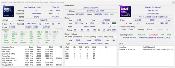 | Lenovo ThinkPad T1g Gen 8 21TD003GE Intel Core Ultra 9 285H ⎘ NVIDIA GeForce RTX 5070 Laptop ⎘ 64 GB Memory, 2048 GB SSD | Amazon: List Price: 4500€ | 1.9 kg | 15.8 mm | 16.00" 3200x2000 236 PPI Tandem-OLED | |
