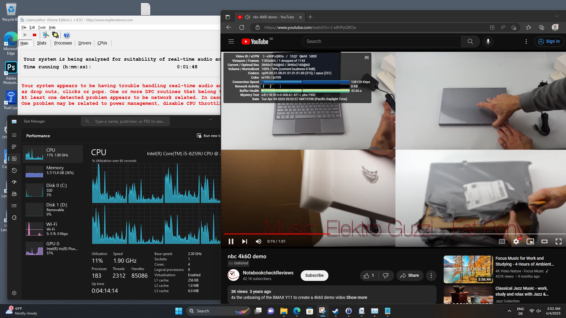 LatencyMon already showed us increased latencies when opening several tabs using Edge browser. These latencies did not increase further when playing the 4K YouTube test video. We couldn't see any dropped frames and the iGPU of the Intel Core i5-8259U was utilized at up to about 60%.