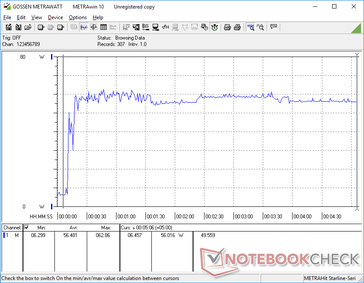 We're able to measure a temporary maximum consumption of 66.8 W from the small (~6.5 x 6.5 x 2.7 cm) 65 W AC adapter when the system is fully stressed.