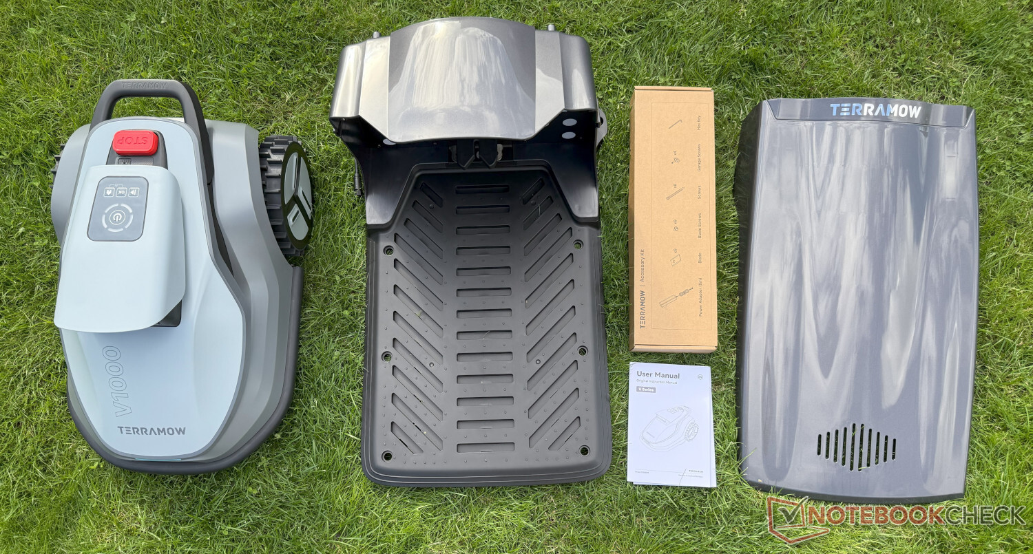 If the TerraMow V1000 needs to be cleaned, it can be sprayed with a garden hose thanks to its IPX6 rating. The blades can be changed using a screwdriver, which is not supplied. Incidentally, the roof of the garage can be mounted without tools.