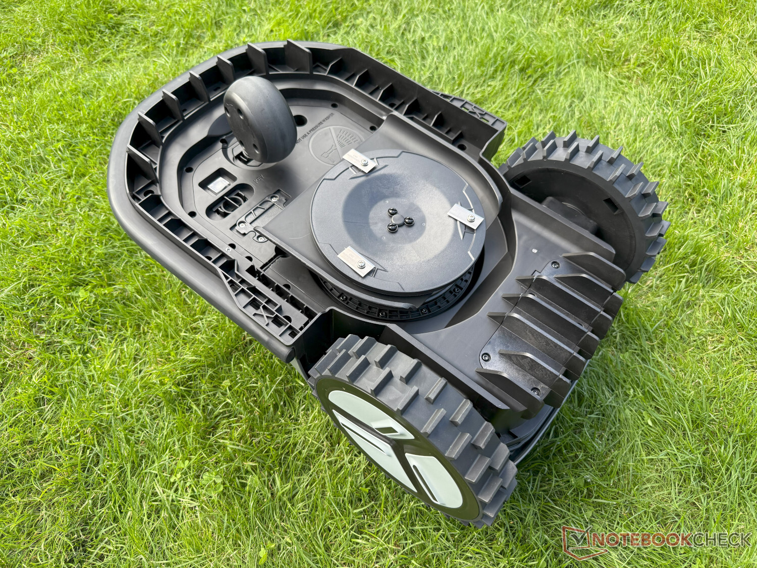 On the underside is a classic mowing disk with three blades and a cutting width of 203 mm. This is relatively manageable, but the V1000 is also only designed for lawns of up to 1,000 square meters. The cutting height can again be adjusted electrically via the app, with a choice between 25 and 75 mm in 5 mm increments.