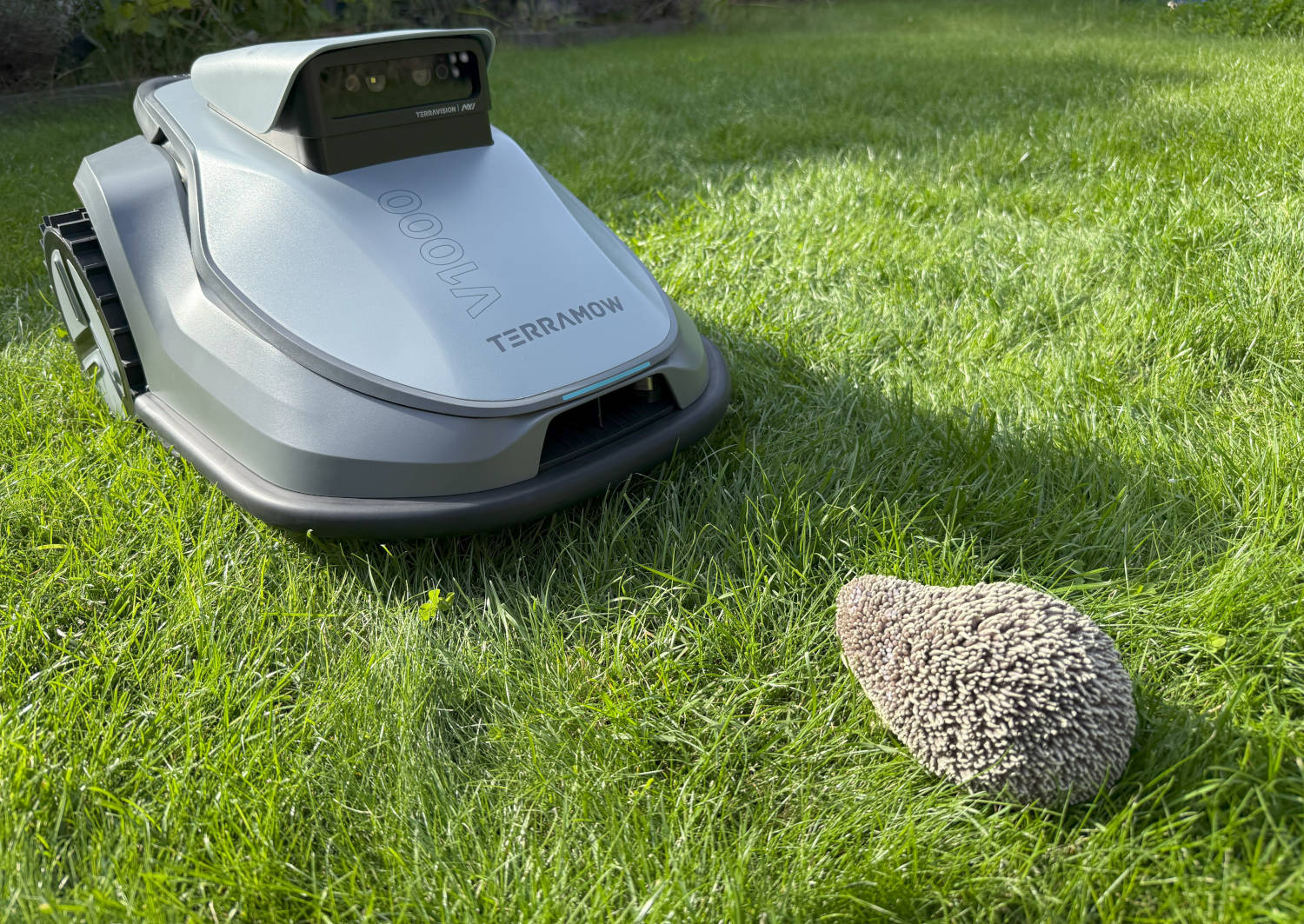 The TerraMow V1000's obstacle detection and avoidance was even better in the test. The robot mower reliably detected all our standard obstacles and avoided them by a small distance without touching them. This meant that not only our hedgehog dummy was able to sunbathe on the lawn without a care. The AI camera system also successfully detected a piece of garden hose lying on the grass and a tennis ball, both of which have already pushed one or two robotic lawnmower test candidates to their limits.