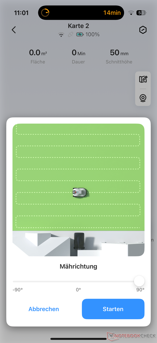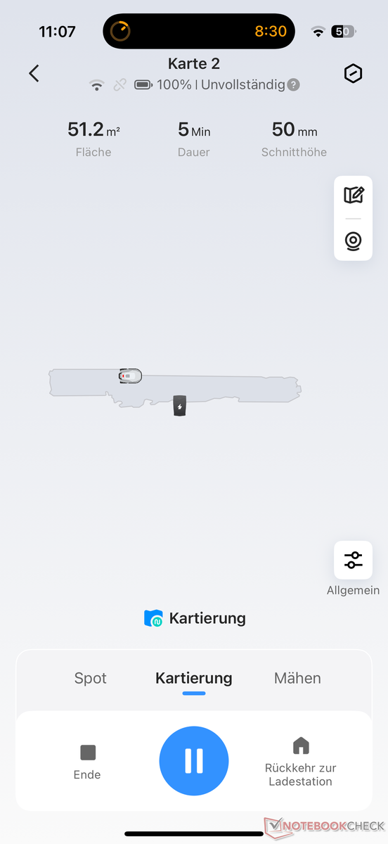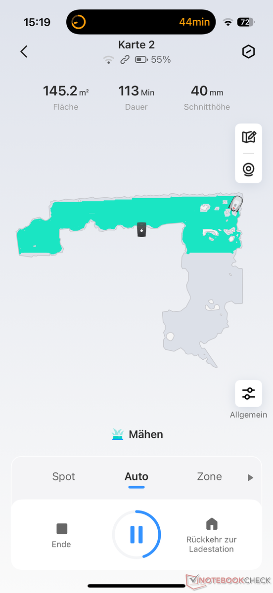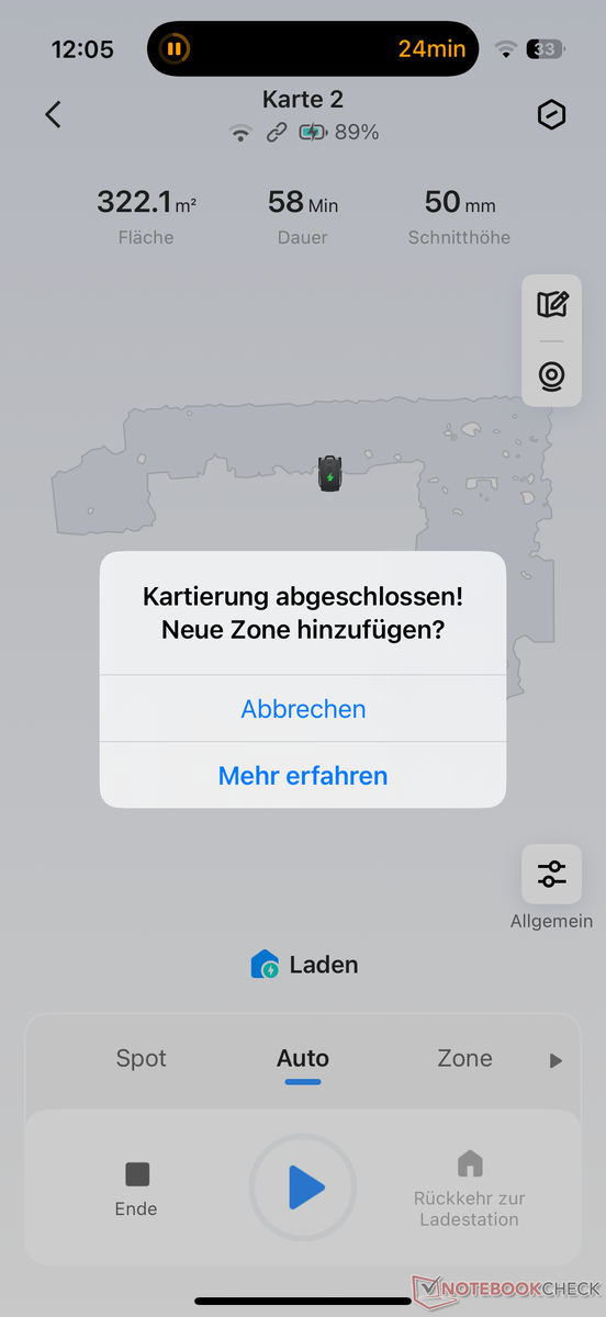 Otherwise, it's the same as last year. After setting up the charging station and establishing a connection with the app, which worked smoothly in our test, the robotic lawnmower is sent on a mapping trip. However, it does not have to be patrolled manually around the lawn using a smartphone, which is not even possible. Instead, it explores the lawn independently.