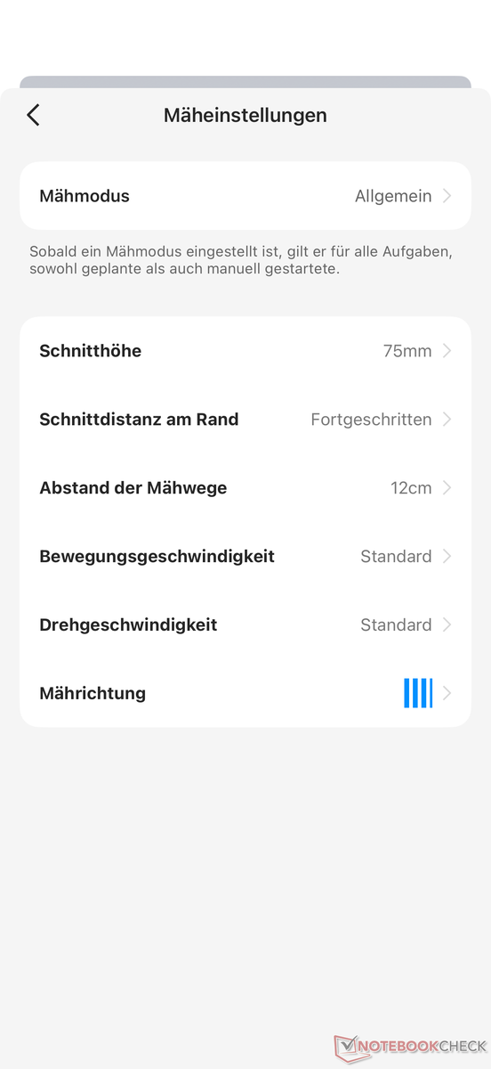 Various options are also available for the general mowing settings. In addition to the mowing mode (general or customized for each zone), the cutting height, the distance between the mowing paths (8 to 14 cm), the movement speed (Fine, Standard, Fast) and the mowing direction (angle freely selectable) can be individually adjusted.