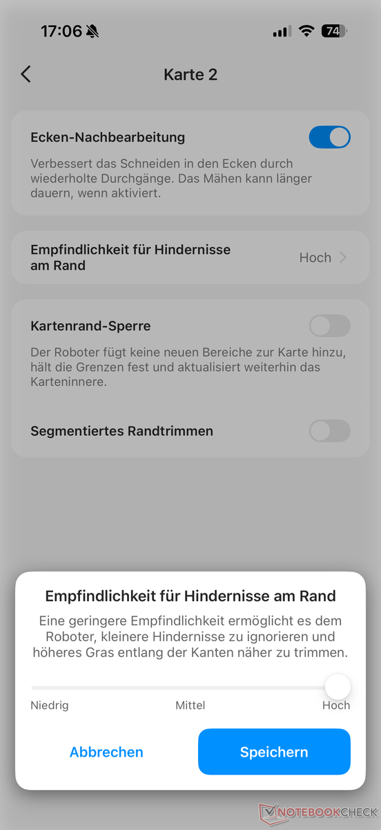 Among other things, you can activate corner reworking here. Then the robot repeats the mowing process in the corners in order to ideally catch more grass. We sometimes observed it reversing into narrow areas, which we have never experienced with any other competitor. Sometimes it even caught a little more grass this way. But the difference is not too big.