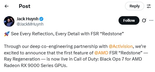 Separately, AMD executive Jack Huynh posted on X that FSR ‘Redstone’ Ray Regeneration is now live in Call of Duty: Black Ops 7 for AMD Radeon RX 9000 Series GPUs, promising that more is to come.