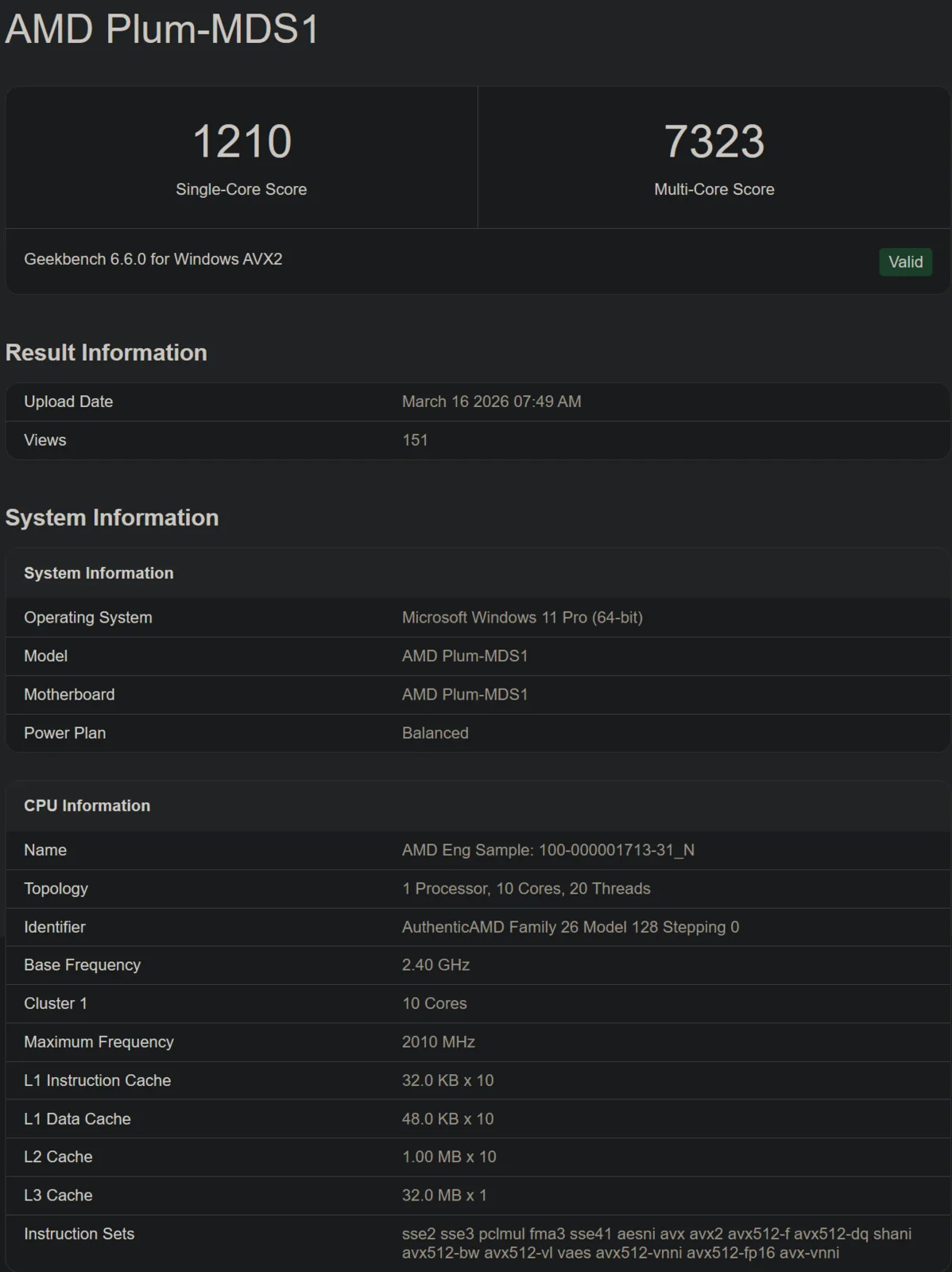 It scores 1,210 and 7,323 points in Geekbench 6.6’s single and multi-core tests, respectively. It has ten CPU cores and 32 MB of cache, a notable upgrade over the 24 MB offered by Gorgon Point. Because it is an engineering sample, the Ryzen AI 9 565 tested here is not operating at its full capacity, as exhibited by its boost clock of 2.3 GHz.