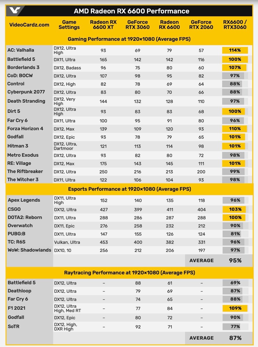 Overall, the Radeon RX 6600 averages over 60 FPS in all games, including when raytracing is enabled. The GeForce RTX 2060 does so as well in all but Assassin's Creed Valhalla, mind you. The GeForce RTX 3060 also yields significantly higher FPS than the Radeon RX 6600 with raytracing at 1080p, F1 2021 excluded. The Radeon RX 6600 is also a way off the Radeon RX 6600 XT, so it will be interesting to see what price point the former arrives at next week.