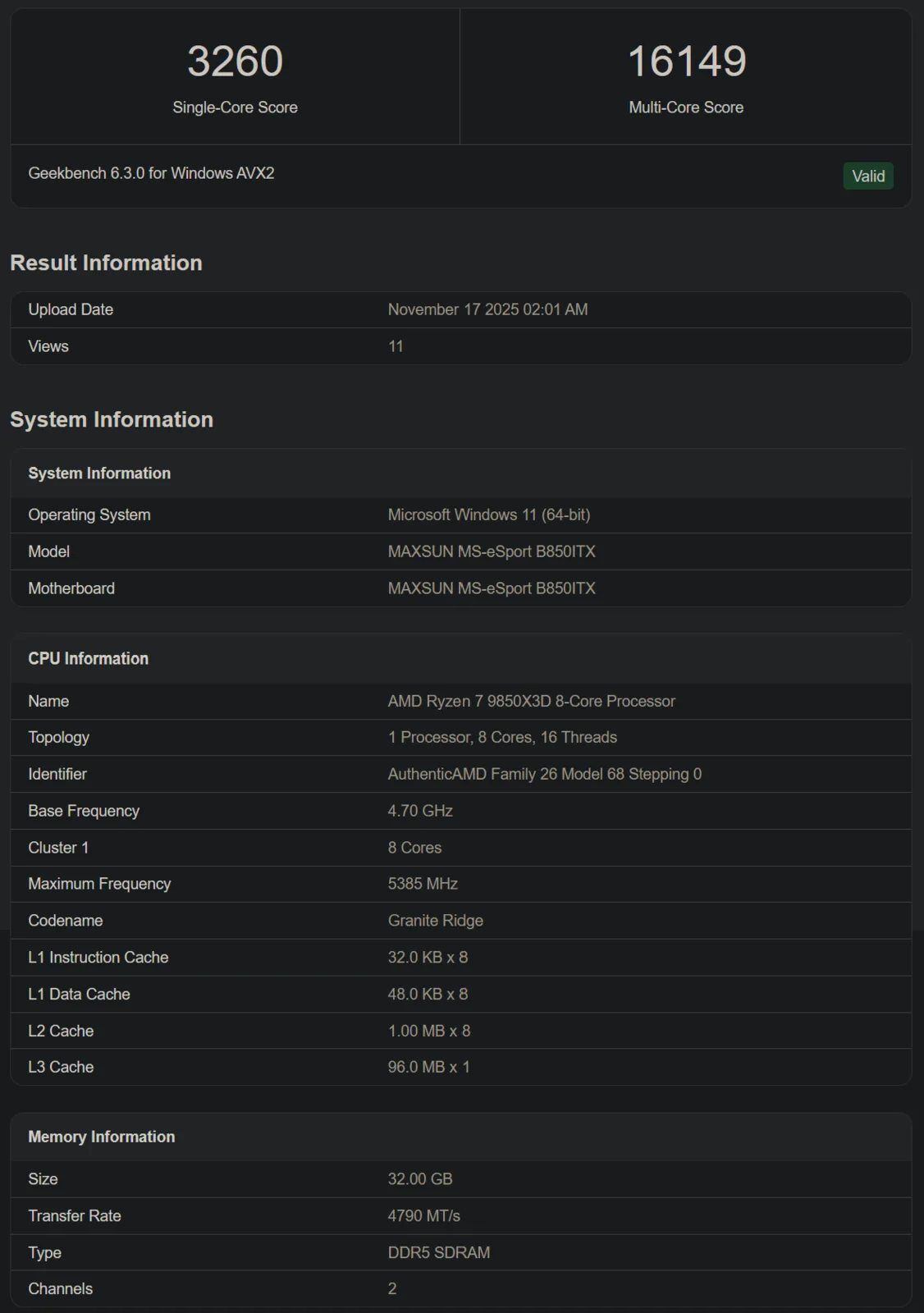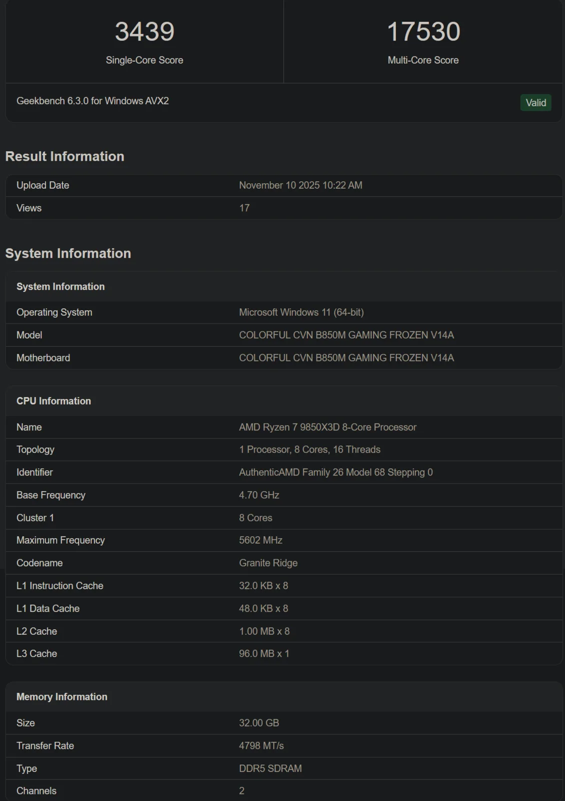 One lists it at 5.6 GHz, while the other states it is 5.4 GHz. Then again, the chip was tested on different motherboards, and that may have influenced the results. In its first run alongside the Colorful B850M, the Ryzen 7 9850X3D scores 3,439 and 17,530 points and 3,260/16,149 in the second (Maxsun B850ITX motherboard).