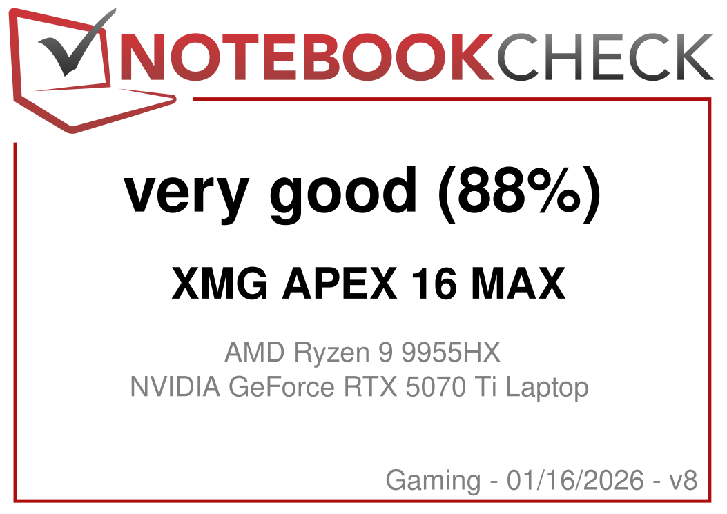 With the Apex 16 Max, XMG has a powerful gaming laptop on offer that should appeal to the most price-conscious buyers. The starting price with IPS display and RTX 5070 Ti is currently around €2,090, while our test device costs around €2,800, mainly due to the generous memory configuration (64 GB RAM, 2 TB SSD) and the mini LED panel.