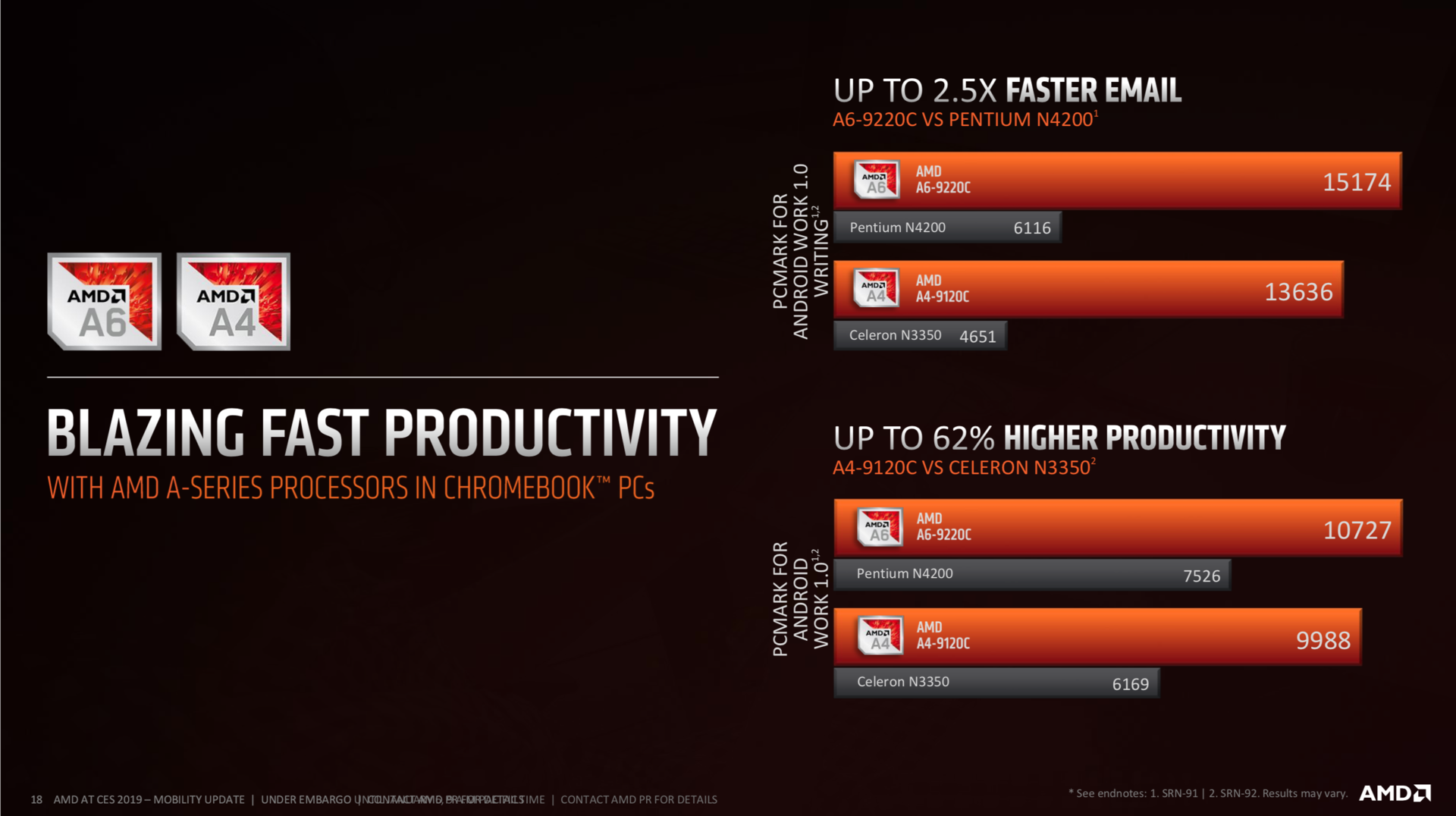 Both CPUs are targeted against modern Pentium and Celeron SoCs in cheap PCs and Chromebooks. Compared to these, AMD advertises the better performance of the A4 and A6 powered Chromebooks. The efficiency however, should be a lot better for the Intel based processors.