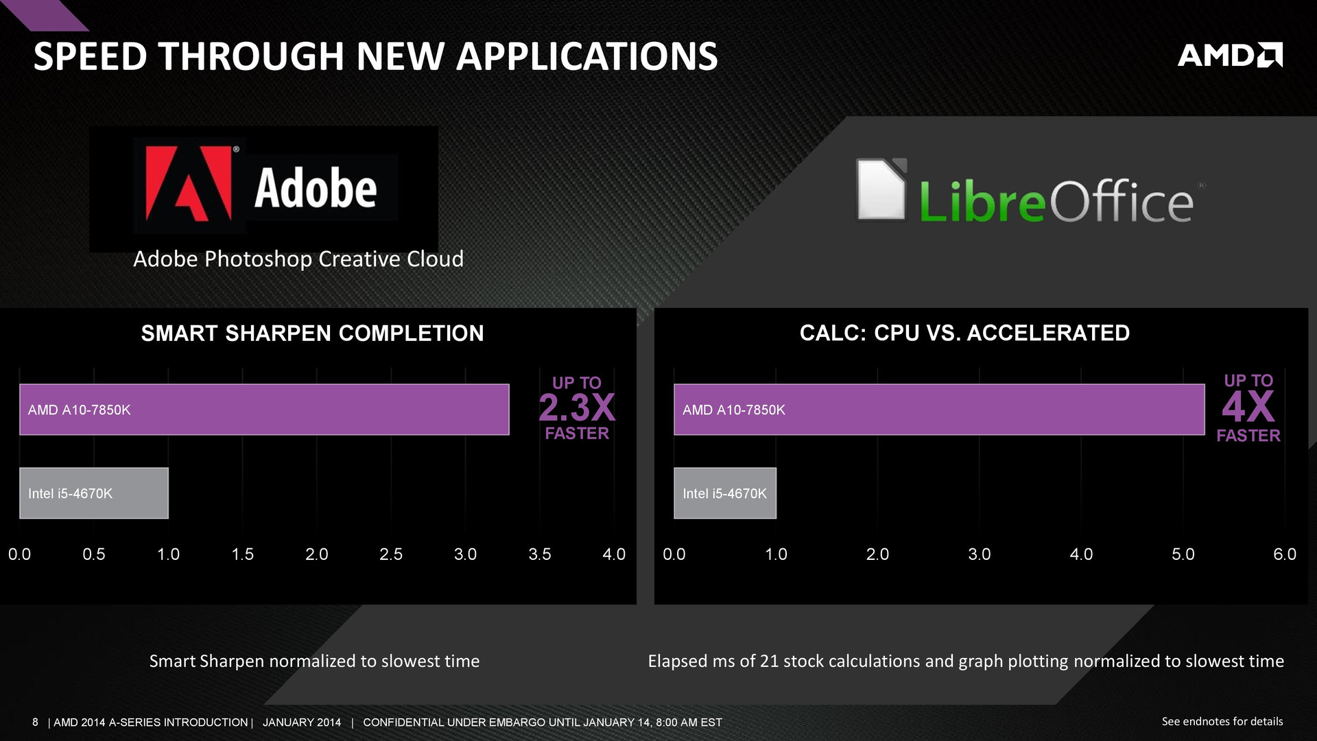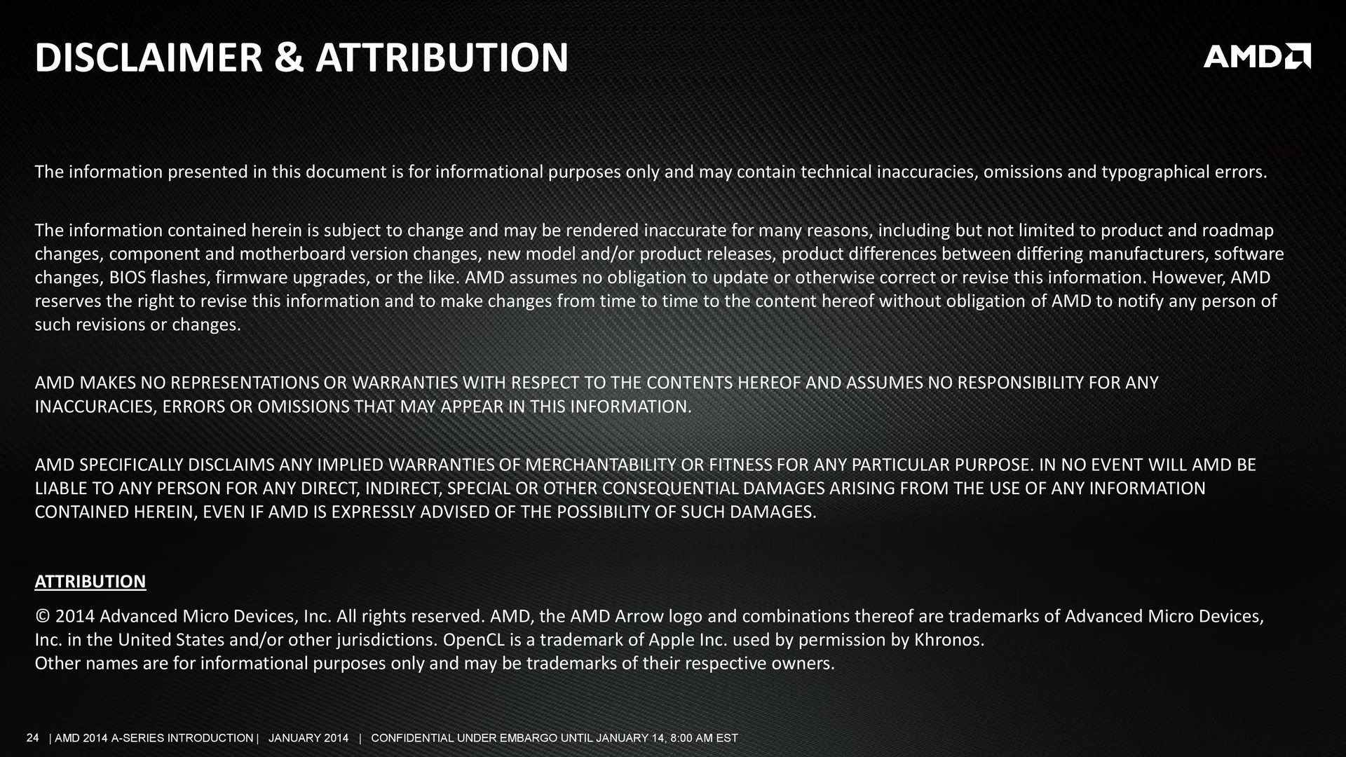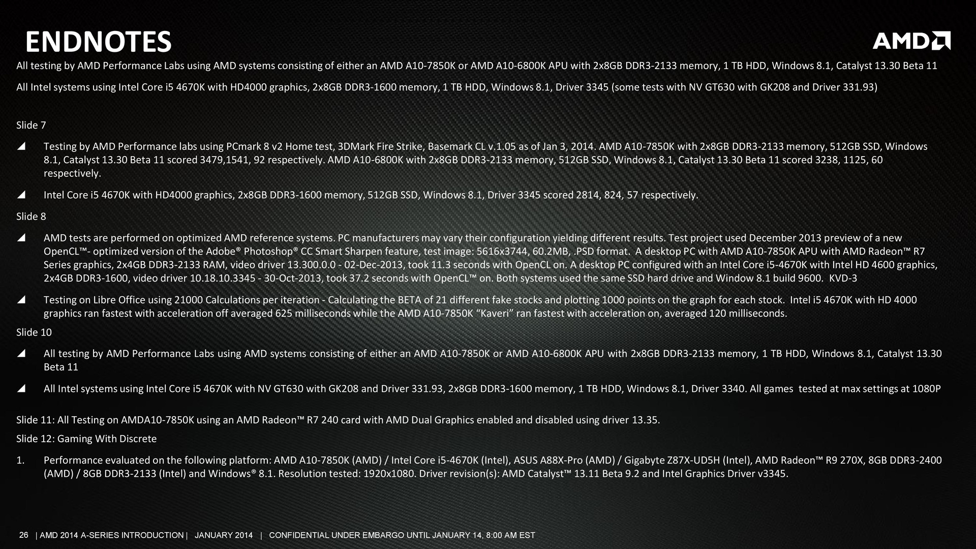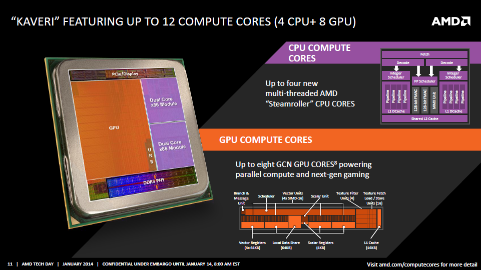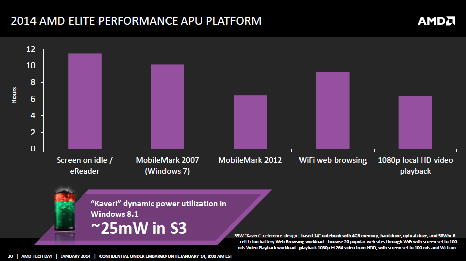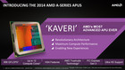 Beyond the Kaveri reveal, we are particularly excited about the eventual notebook APU models. Though AMD has remained mum, users should expect Kaveri to appear in the low-power segment for notebooks. DDR3-2400 support is not expected, but performance gains are expected followed by increased battery life in S3 mode. Depending on Intel's roadmap, Kaveri may very well be face-to-face with Broadwell soon after its launch instead of the current Haswell generation.