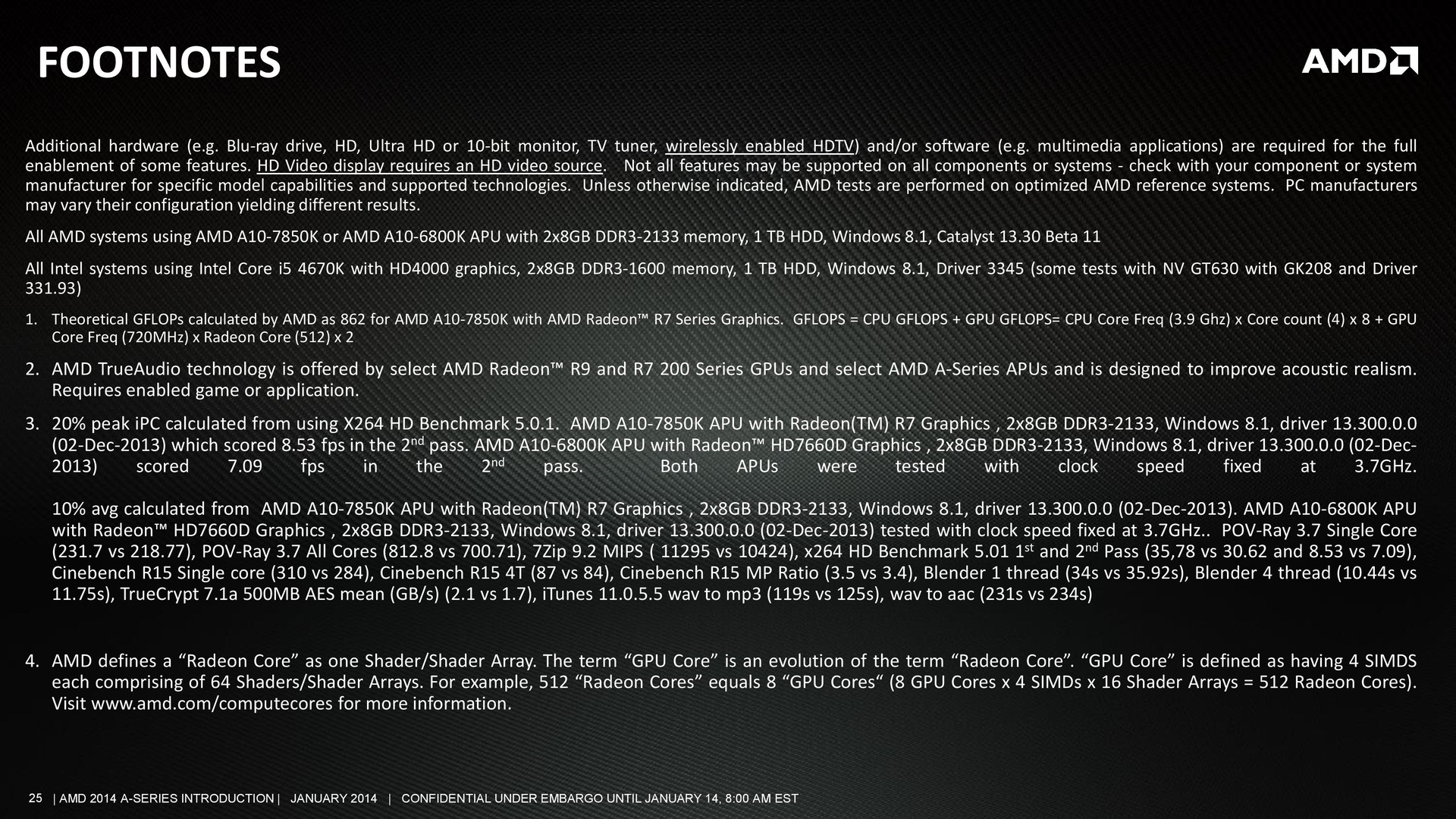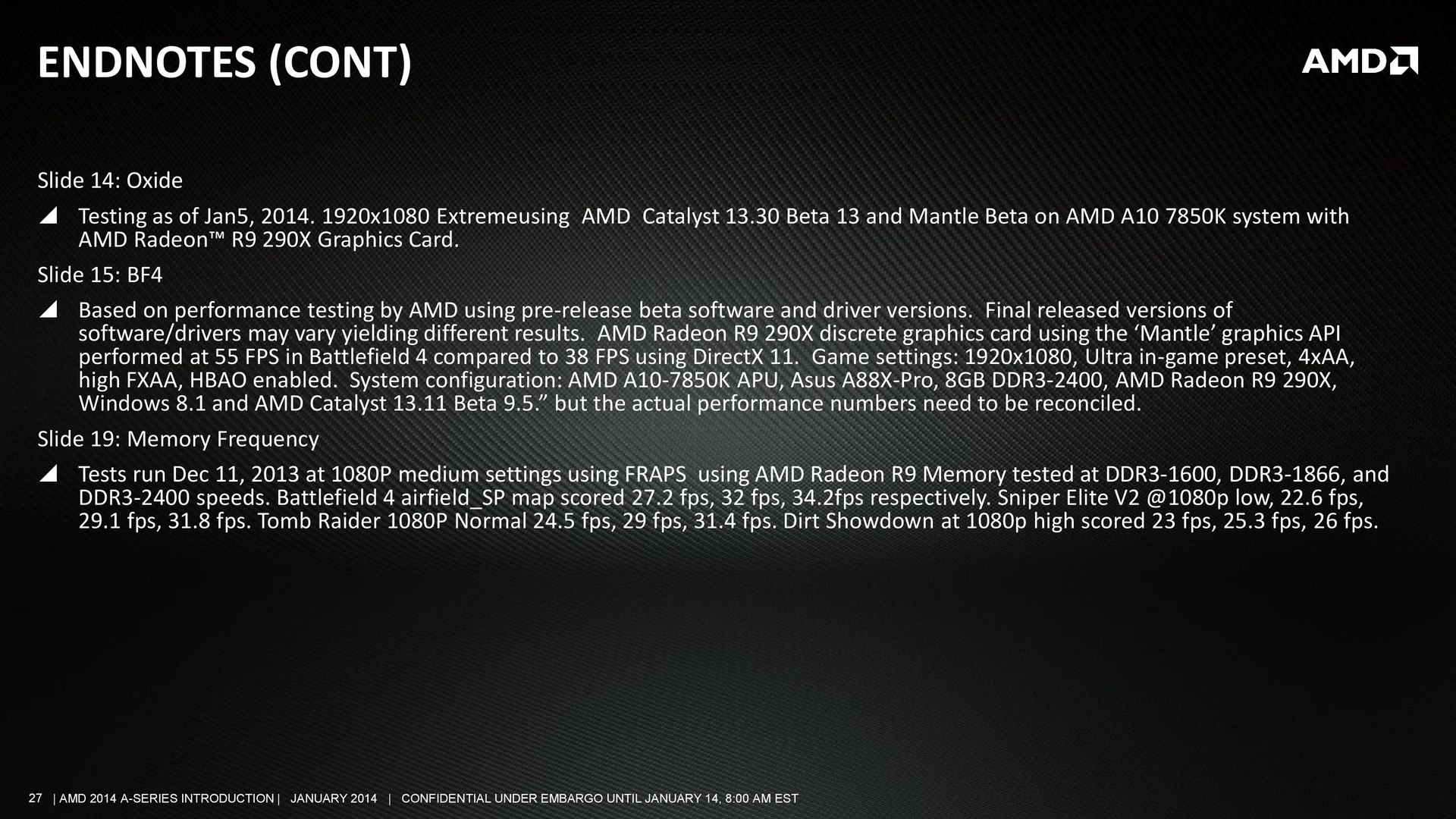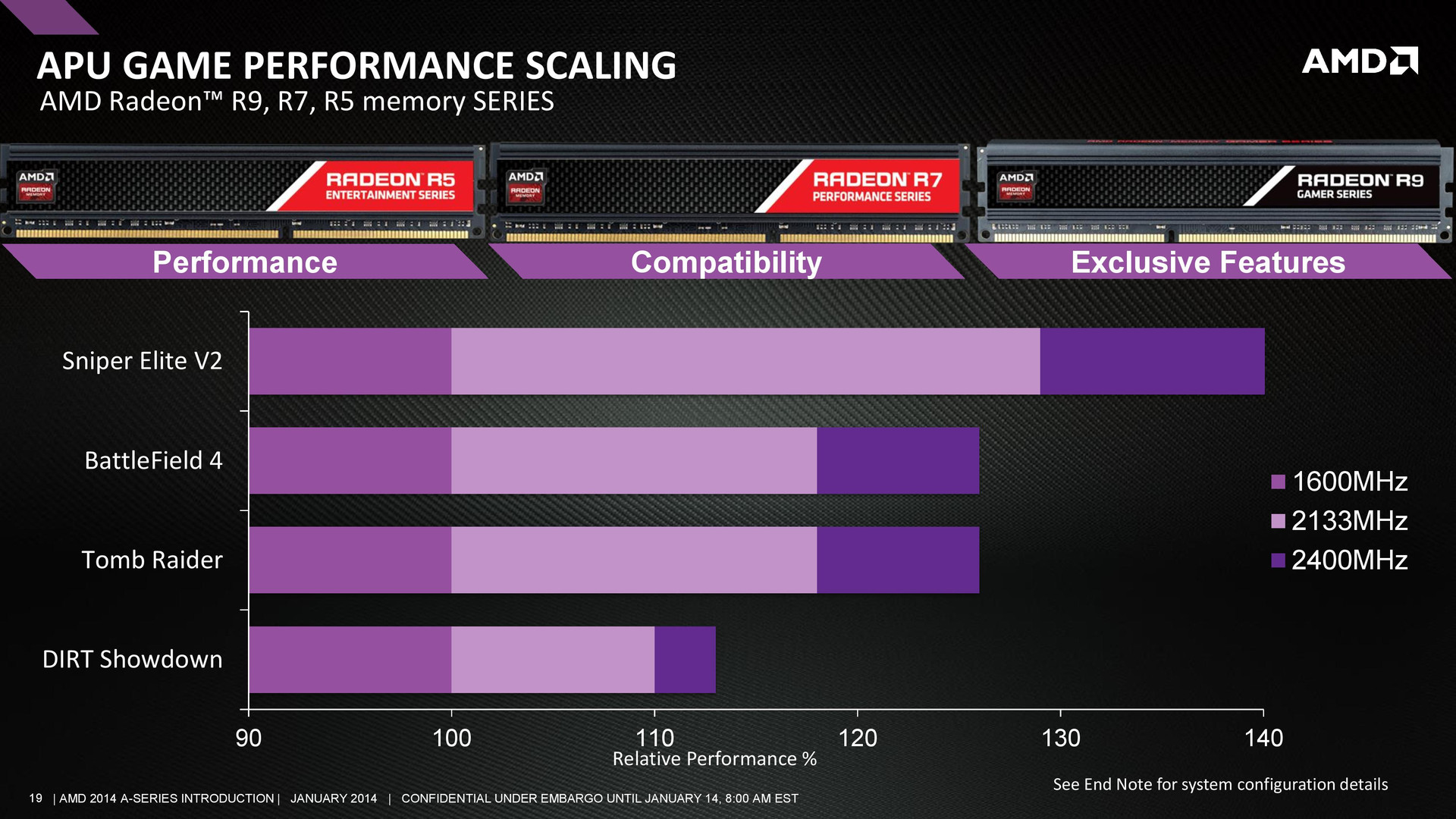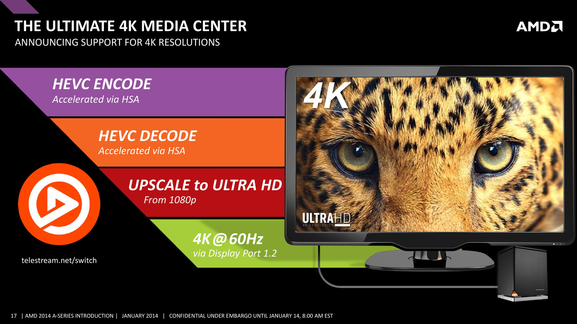 Beyond the Kaveri reveal, we are particularly excited about the eventual notebook APU models. Though AMD has remained mum, users should expect Kaveri to appear in the low-power segment for notebooks. DDR3-2400 support is not expected, but performance gains are expected followed by increased battery life in S3 mode. Depending on Intel's roadmap, Kaveri may very well be face-to-face with Broadwell soon after its launch instead of the current Haswell generation.