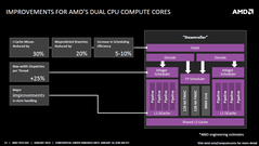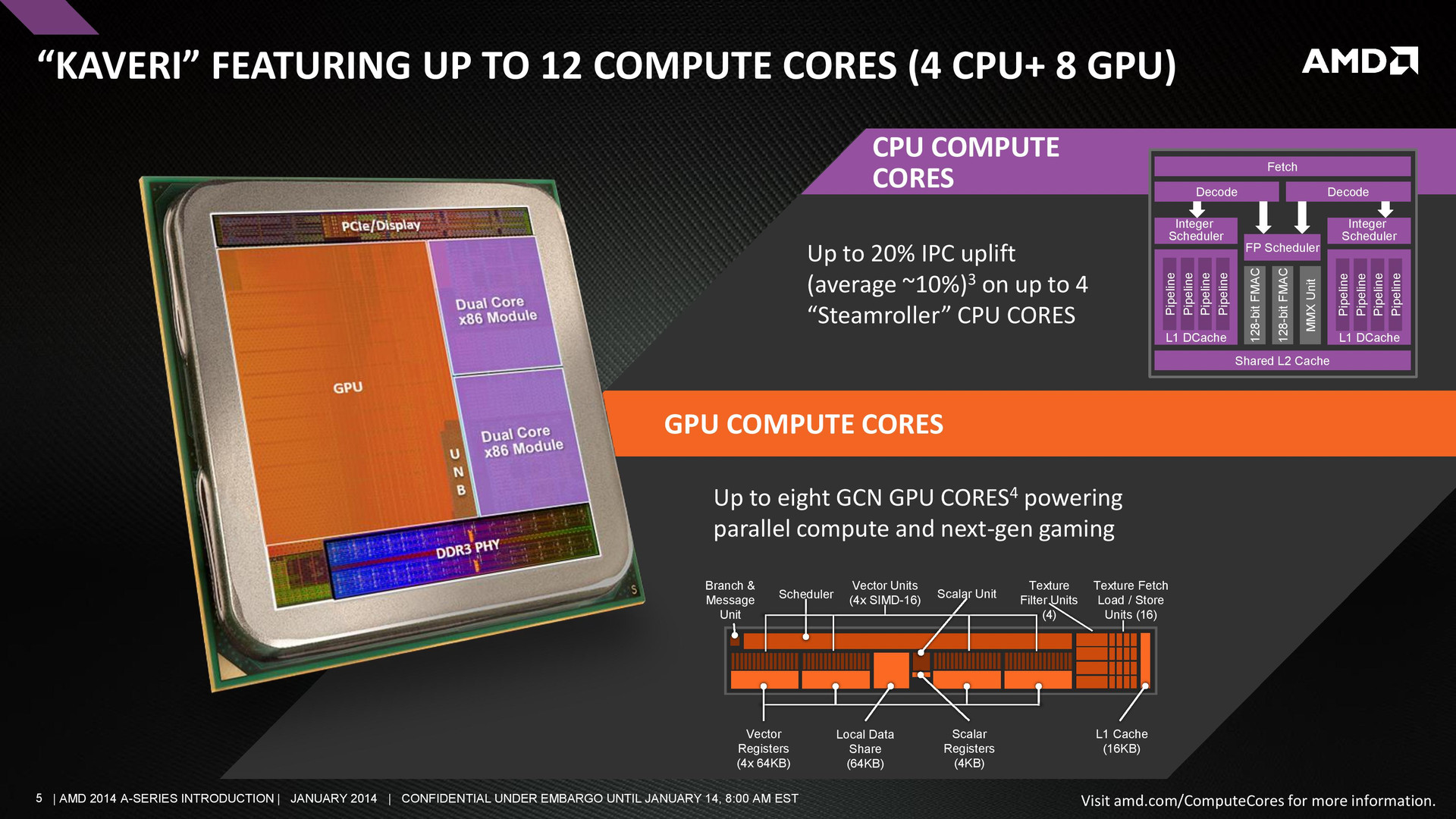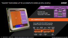 Like its predecessors Trinity and Richland, Kaveri builds upon the Bulldozer design. A maximum of two modules are available with two cores, though AMD mentions four compute cores in its PR. The new architecture is expected to outperform Steamroller and Piledriver (Trinity/ Richland) by about 10 percent in terms of performance-per-watt due to improved branch prediction, additional decoders and a higher L1 cache.