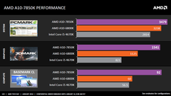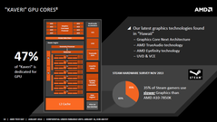 The reason for this lies in the new 28 nm SHP process at GlobalFoundries. This process was developed specifically for Kaveri to satisfy the different demands of the CPU and GPU portions of the APU. By allowing both very high clock rates in one area and a denser packing in another, AMD claims to have been able to fit 2.41 billion transistors in an area of just 245 mm2. In contrast, a typical 32 nm Richland APU was of a very similar size made up of "only" about 1.3 billion transistors.
