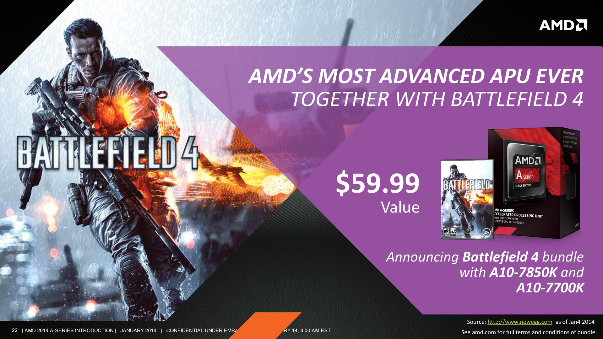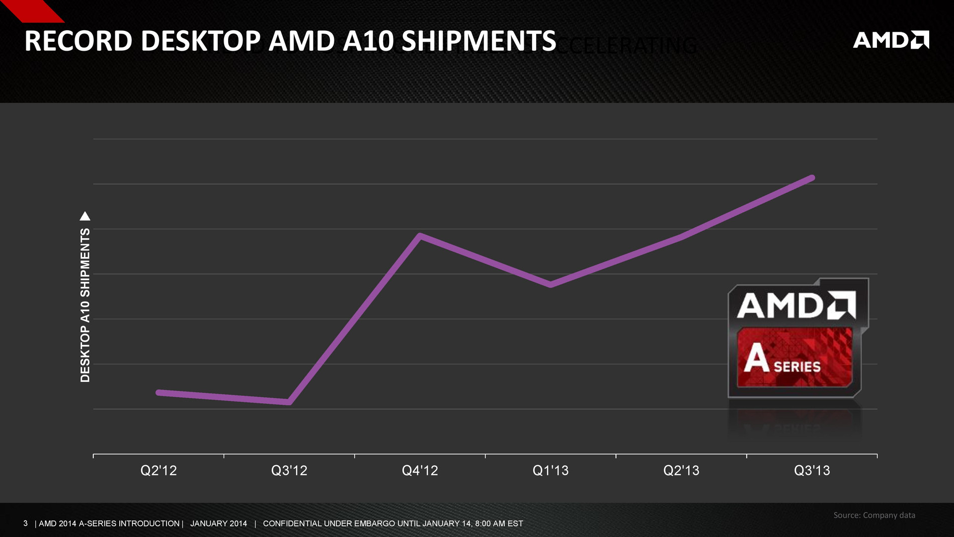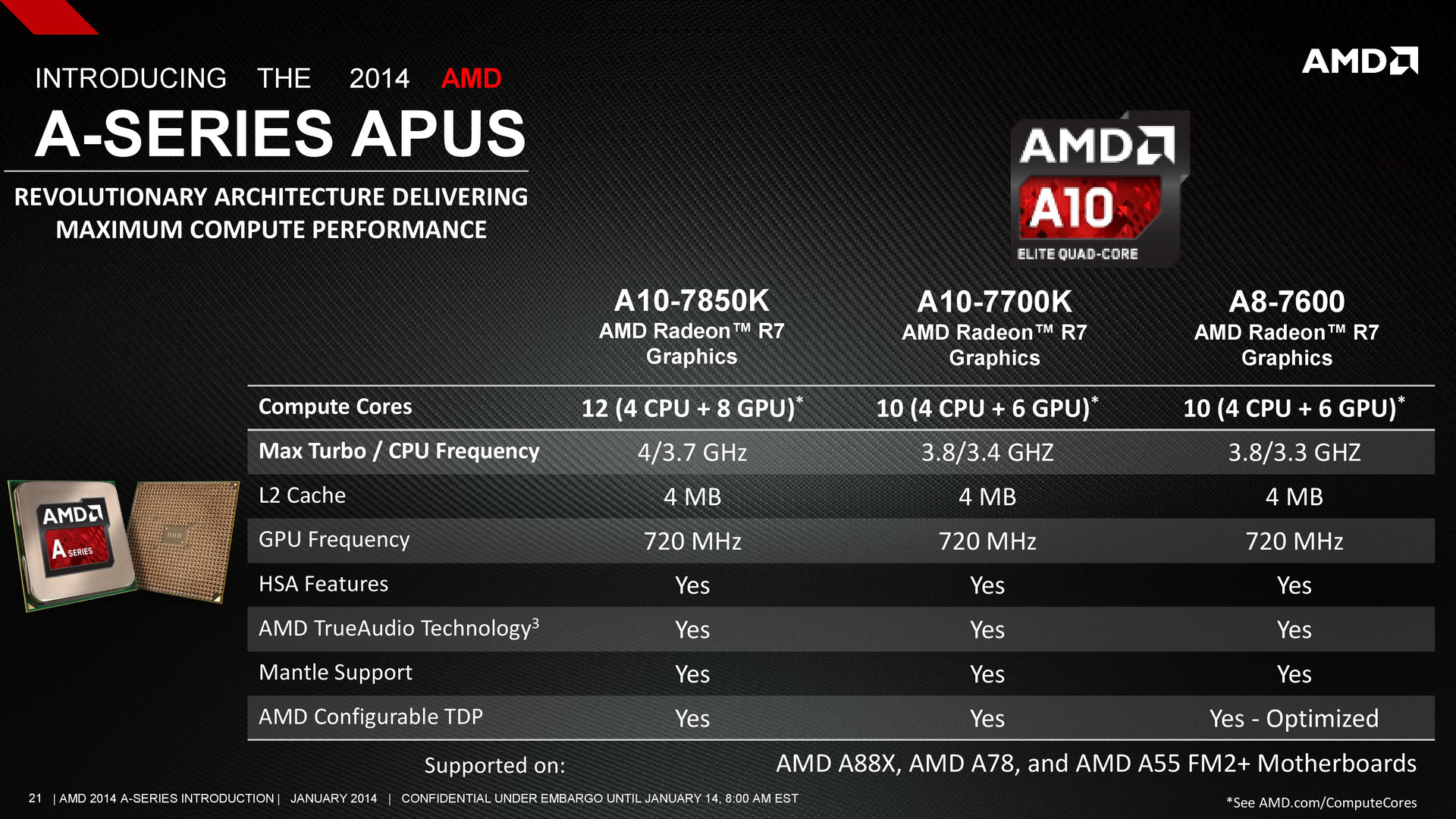 We begin with the first two announced models: the A10-7850K and A10-7700K. A third model, the A8-7600, is expected to follow later in the first quarter. The official technical specifications for these models are as follows: