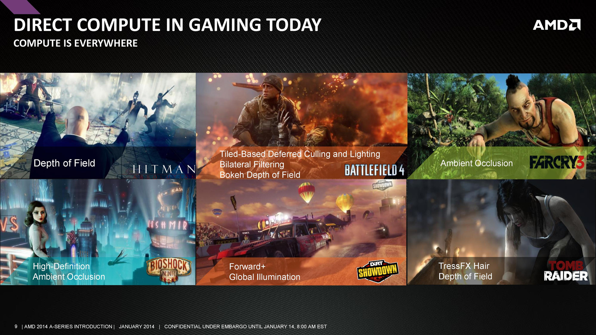 Another major feature of Kaveri is the HSA (Heterogenous System Architecture) concept. Various monitoring tools will help ensure that the entire APU and GPU can be used as efficiently as possible for general calculations. Meanwhile, HUMA (Heterogenous Uniform Memory Access) will allow for data that can be more easily shared and addressed between the CPU and GPU for reduced latency and power consumption. A similar technology can be found in the XBox One and Playstation 4 consoles which, perhaps unsurprisingly, are powered by AMD APUs.