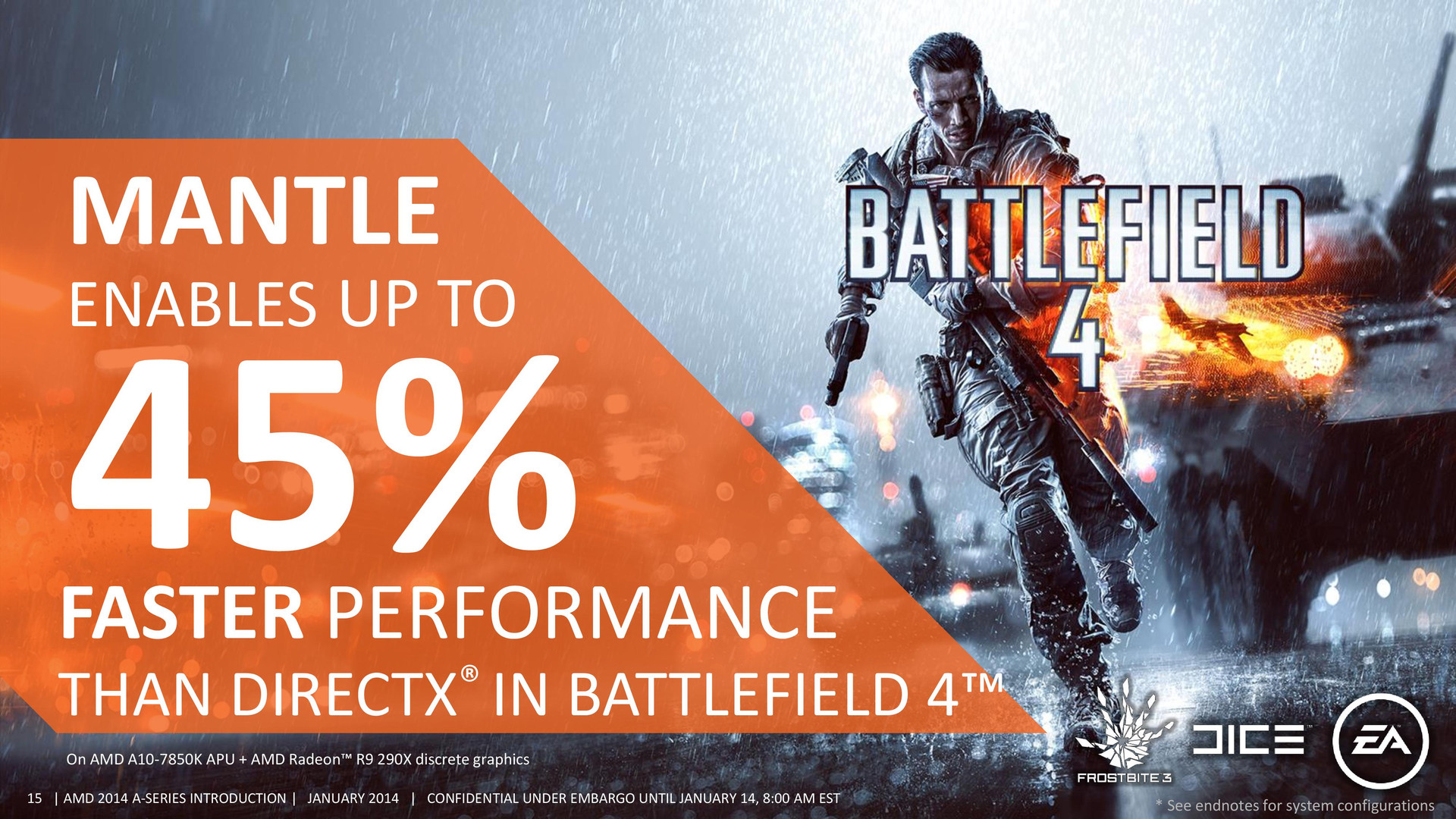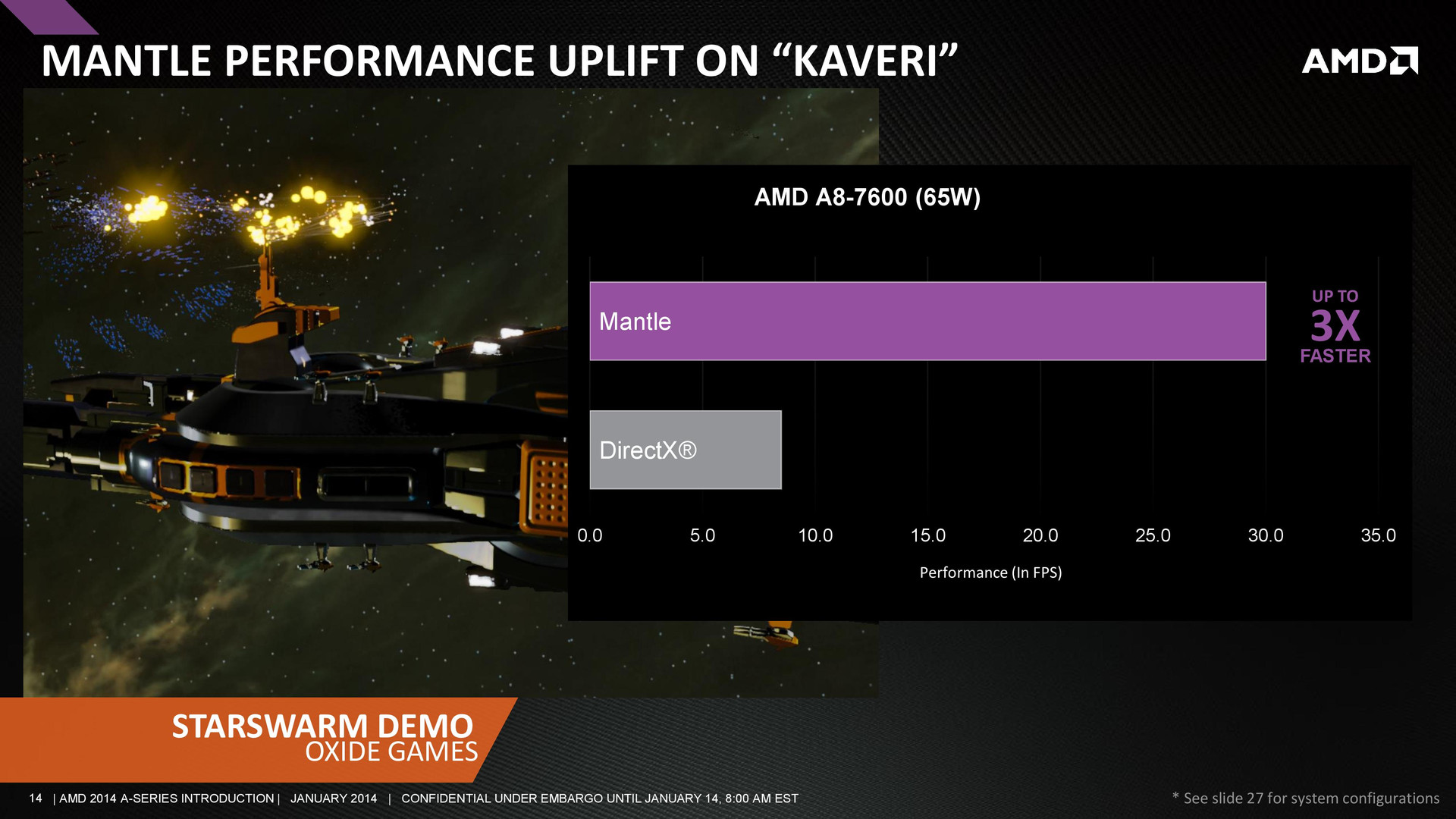 The increased transistor budget was heavily invested in the integrated GPU. Kaveri has upped the number of VLIW4 ALUs from 384 shaders in Trinity/ Richland to 512 shaders and 8 Compute Units, all based on the GCN architecture with cues from the Radeon R9 290X GPU. In addition to the DirectX 11.2 and Mantle API feature sets, raw GPU performance has increased noticeably. The 45 W A8-7600, for example, returned results that were about 30 percent higher than the previous A10-6800K leader in 3DMark Fire Strike, according to AMD.