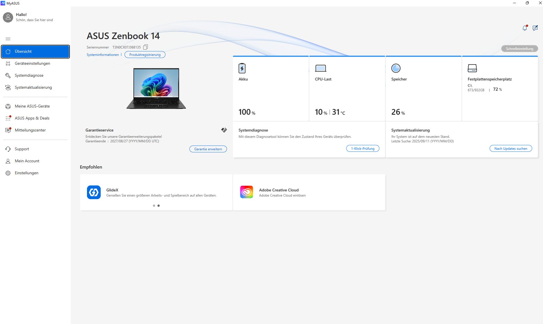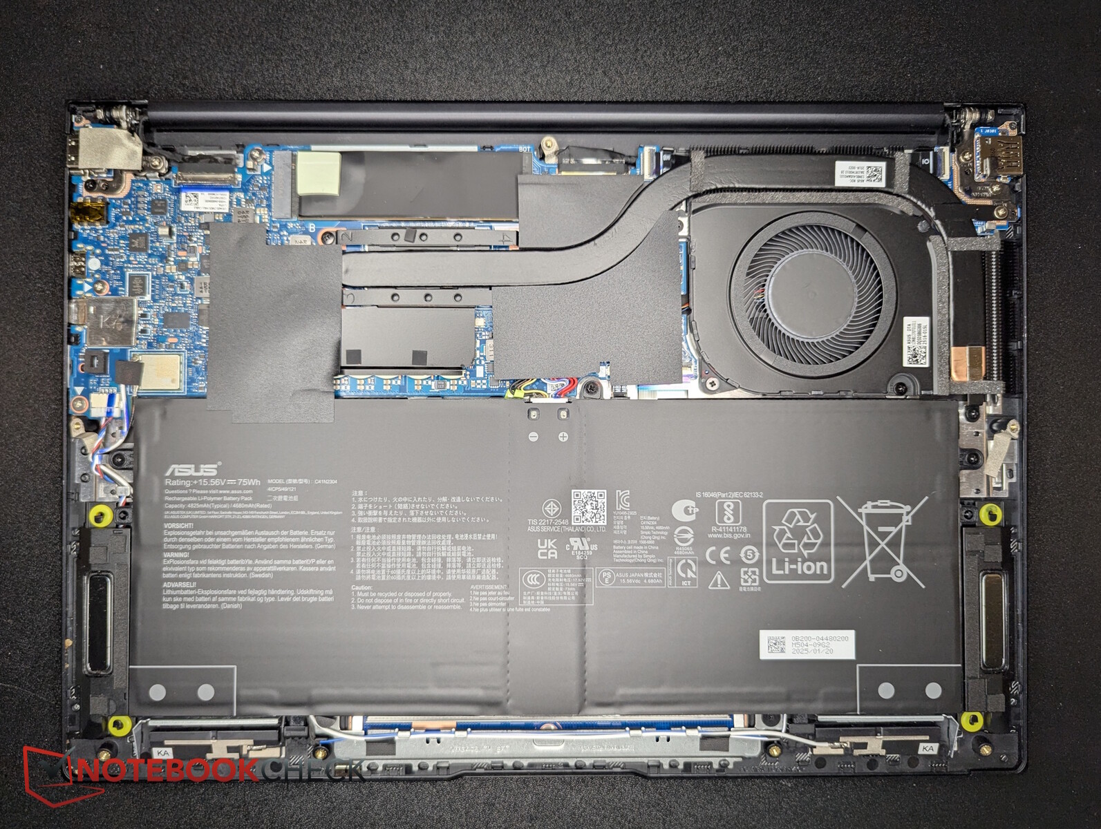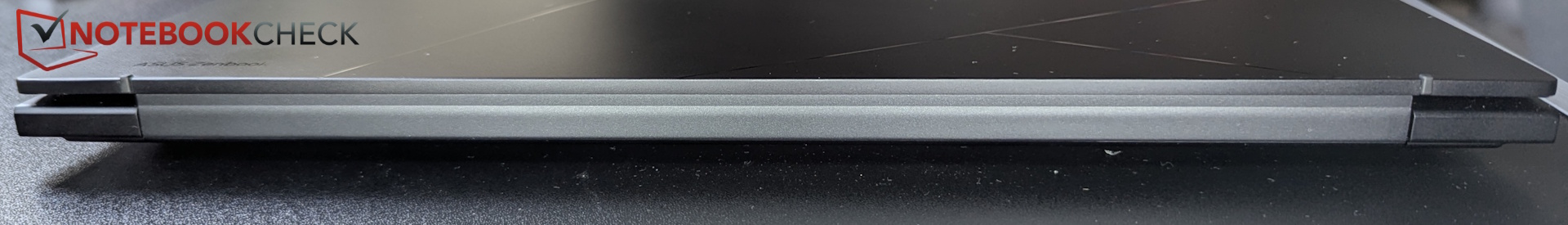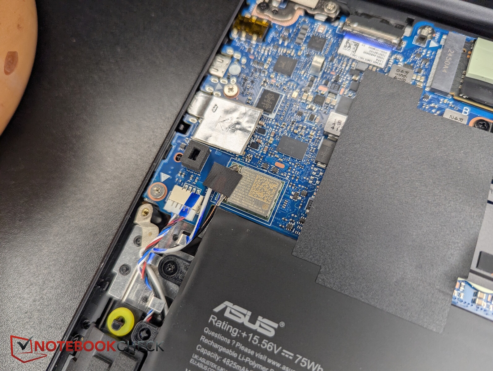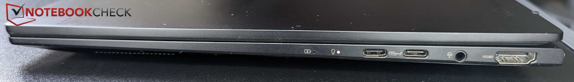 On the connectivity front, nothing has dramatically changed: the USB‑A port still tops out at 5 Gbit/s, and there’s no card reader. While the Intel model offers two Thunderbolt ports, the AMD version has one USB4 and one USB‑3.2 Gen 2 Type‑C port. We’d still prefer Asus to split the two USB‑C ports so you could charge the laptop from either side without stretching the relatively short power cable.