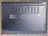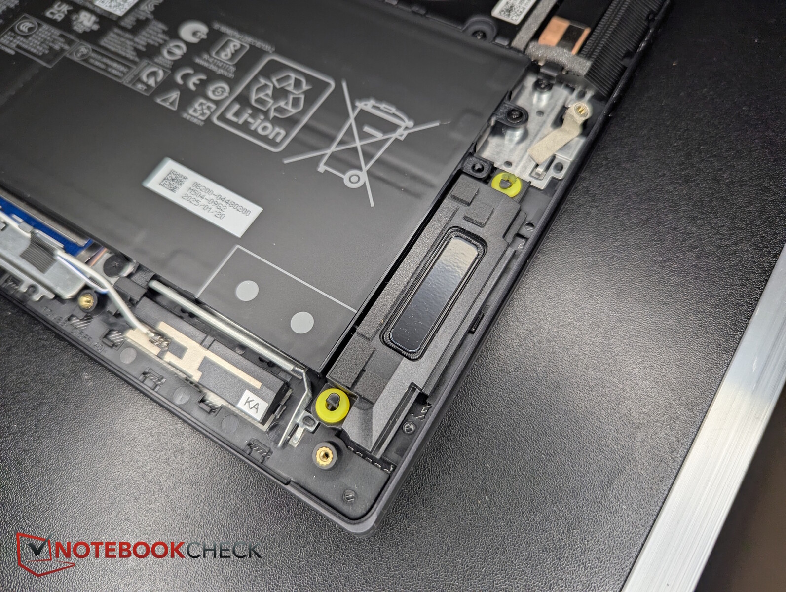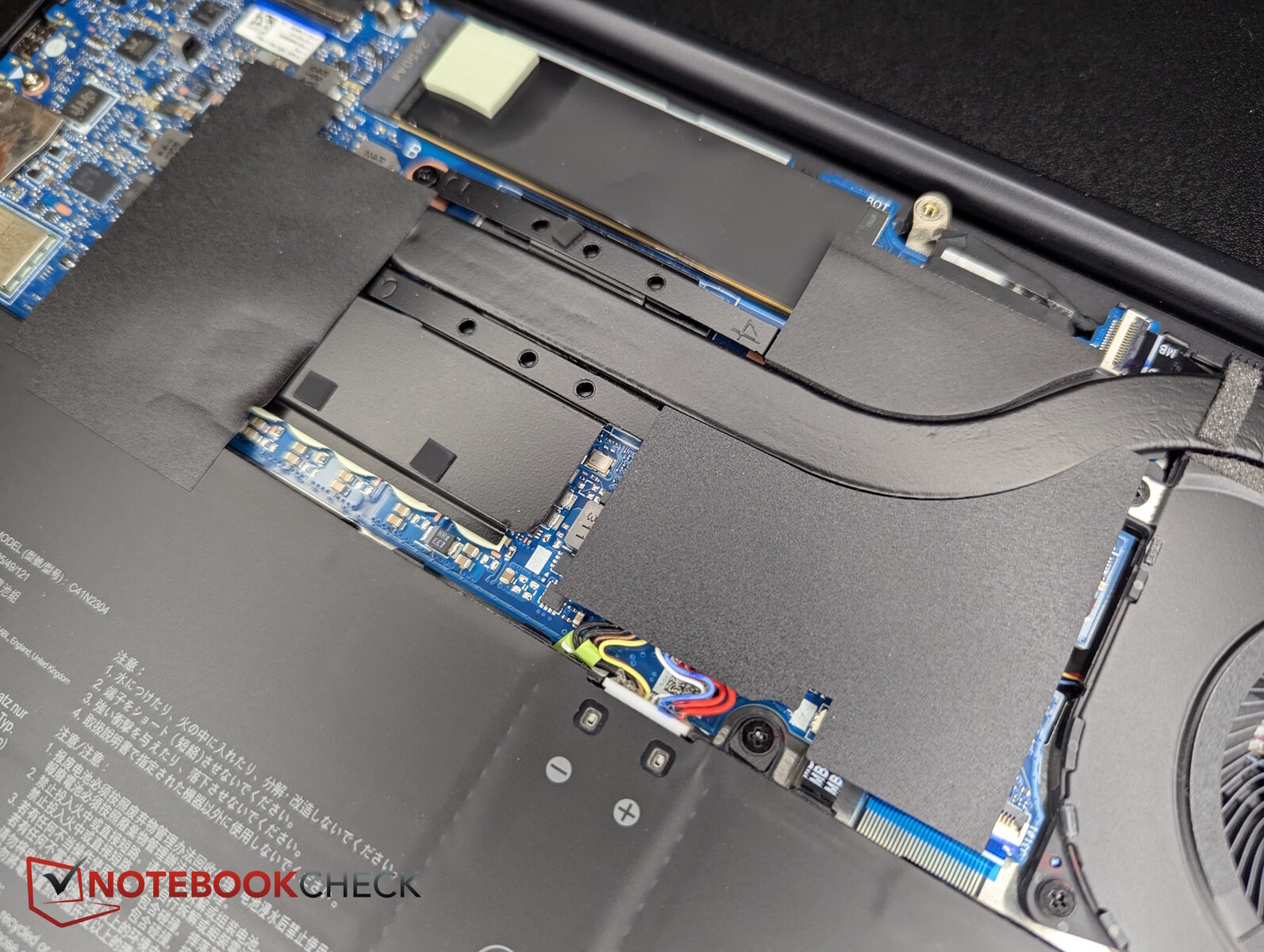 Opening the bottom is straightforward: remove seven T5 screws, then pry the base off. Internally the RAM is soldered and many components sit beneath black covers. The SSD’s placement differs slightly from the Intel model, and the single fan is located on the left when looking at the laptop from above.