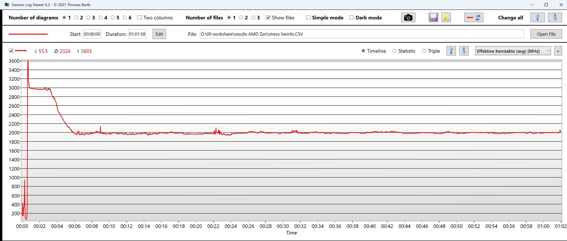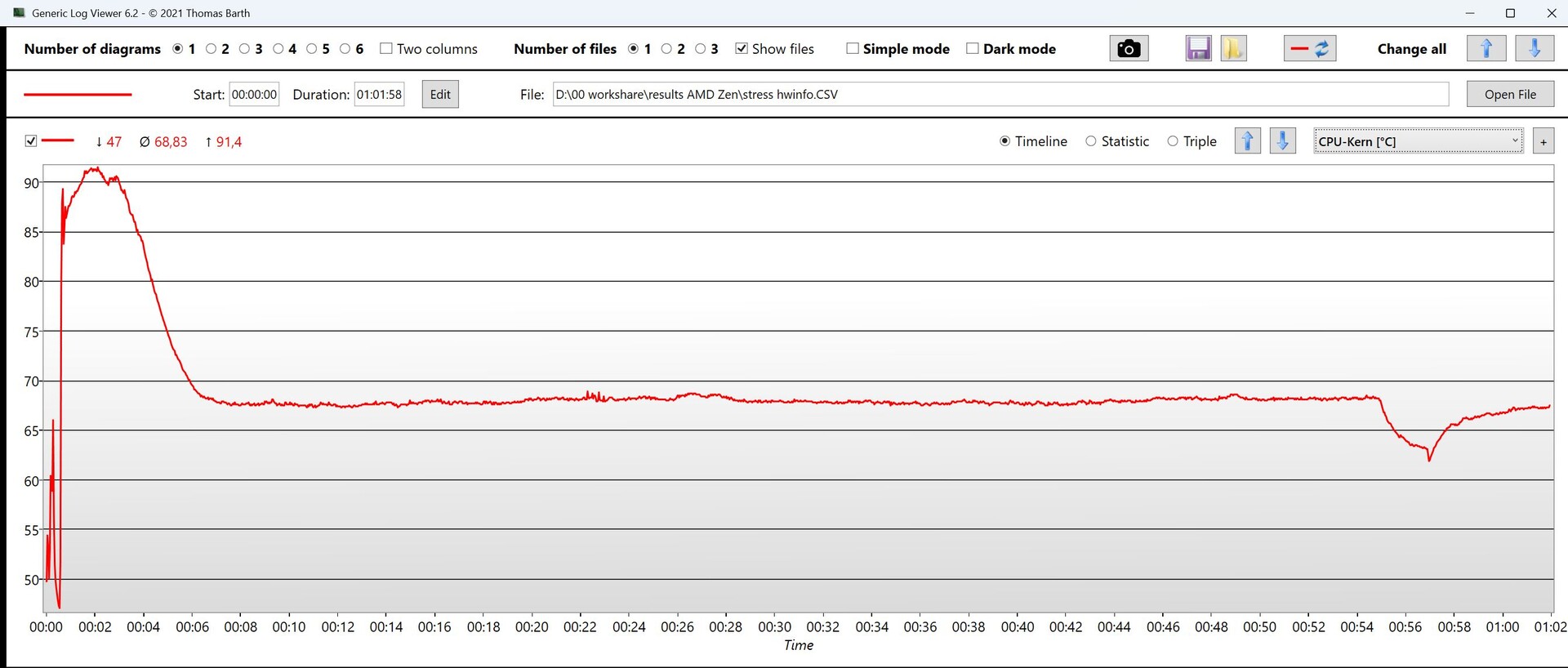 CPU temperature follows, jumping above 90 °C in the first seconds, then stabilizing around ~68 °C for most of the test. Effective average clock lands around 2 GHz.