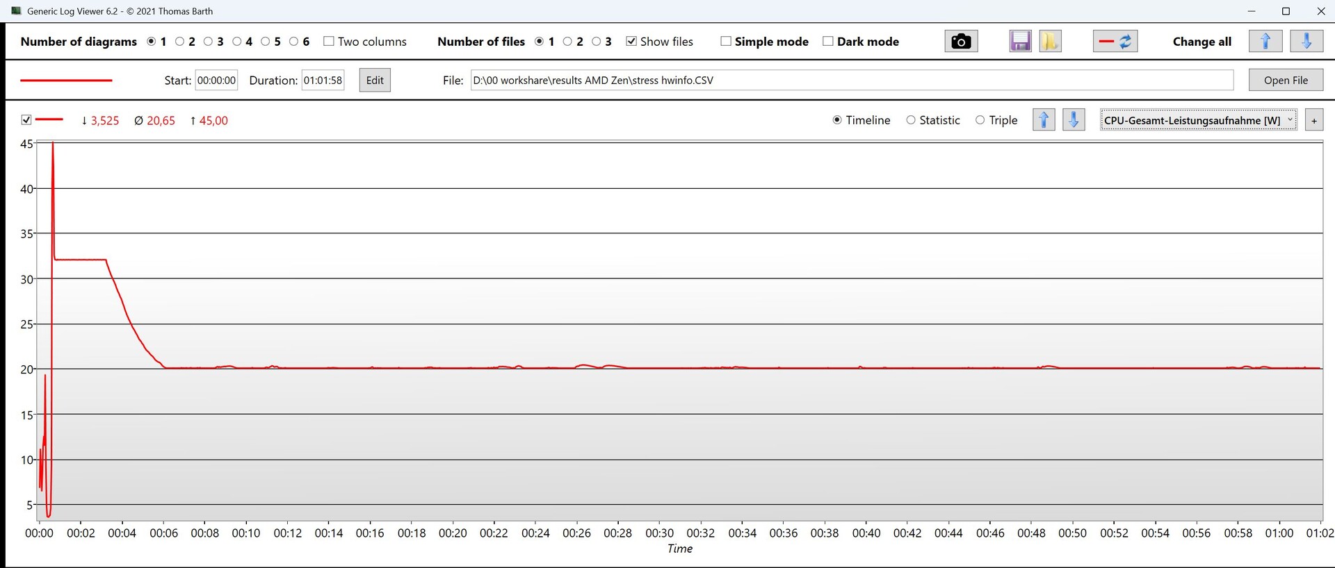 At stress test start, power draw spikes to 45 W for about a second, then to roughly 32 W for two seconds, before settling to a steady 20 W for the remainder of the one-hour benchmark.
