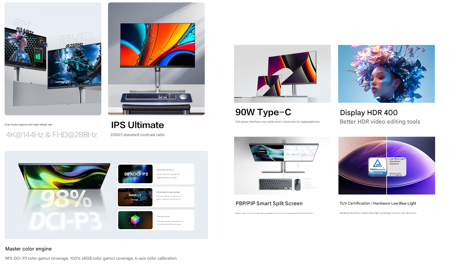 When in the 4K resolution, the refresh rate of the monitor drops to 144 Hz, but with higher clarity, this mode is more suitable for professional workloads. Speaking of which, the AOC U27U3XD has a 27-inch IPS panel with 100% sRGB and 98% DCI-P3 coverage.