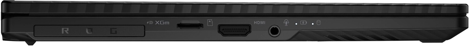 Port selection is particularly interesting since it provides a special ROG XG Mobile interface that allows it to connect to external dGPUs supplied by Asus. This interface is also linked to a USB-C 3.2 Gen 2 port with DP 1.4 mode. Other ports include 1x USB4, another USB-C 3.2 Gen 2 with display and power delivery modes, 1x USB-A 3.2 Gen 2, HDMI 2.1 video output, audio jack and a microSD card reader.