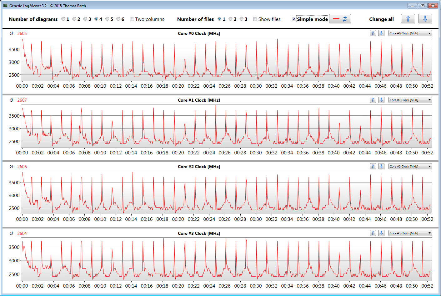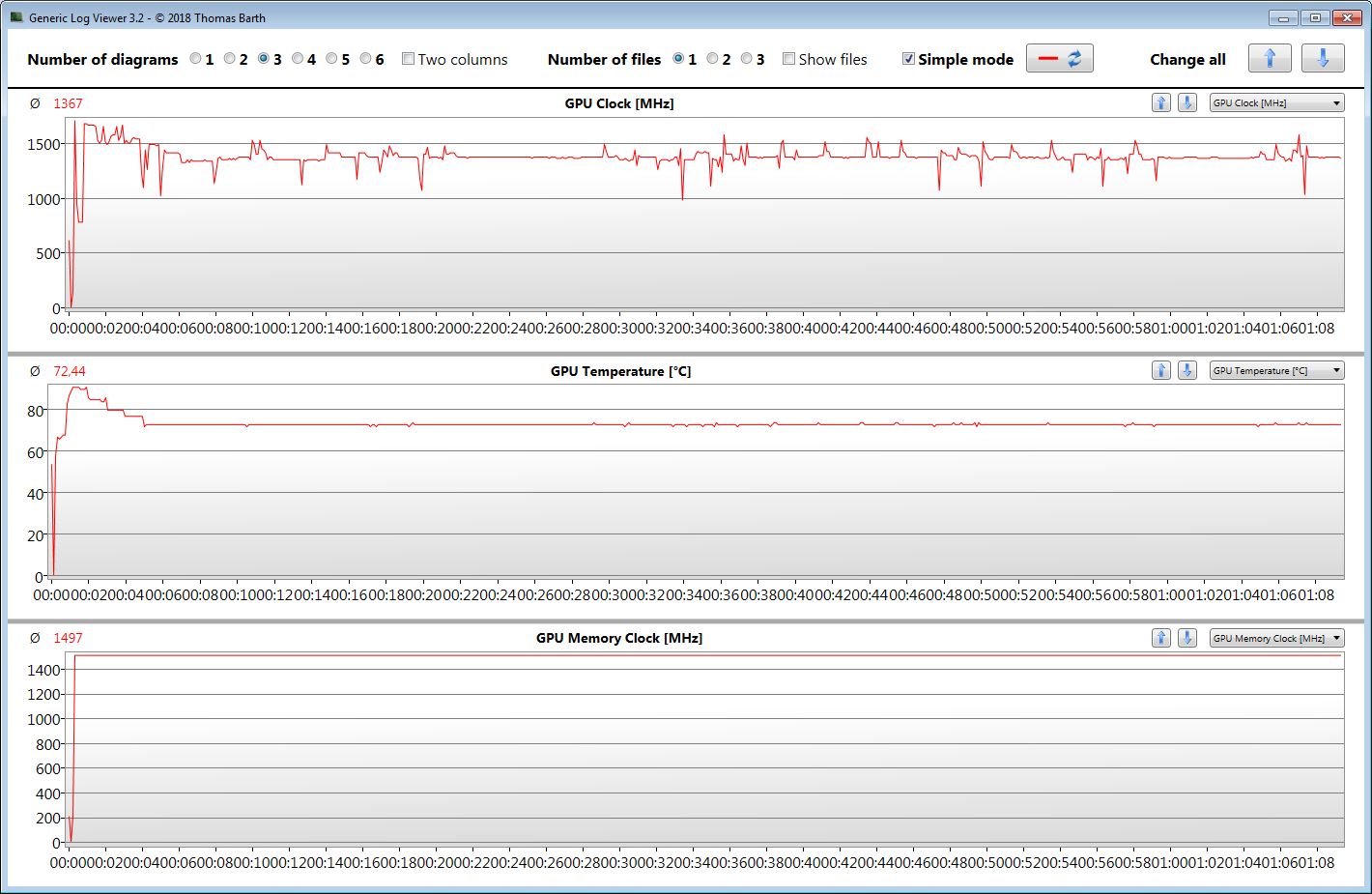 Oddly, FPS nosedive to around 25 FPS after a few minutes before recovering to 50 FPS. This behaviour continued every few minutes before even stabilising between 40 FPS and 45 FPS for most of the test. Examining clock speed behaviour with Generic Log Viewer 3.2 reveals that the GPU can only maintain between 1,350 and 1,360 MHz, which is significantly short of its 1,519 MHz base clock. We ruled out this being a game-based irregularity by re-running the test with Prey, which yielded comparable results. Overall, you can expect an FPS drop of up to 20% by the end of prolonged gaming sessions.