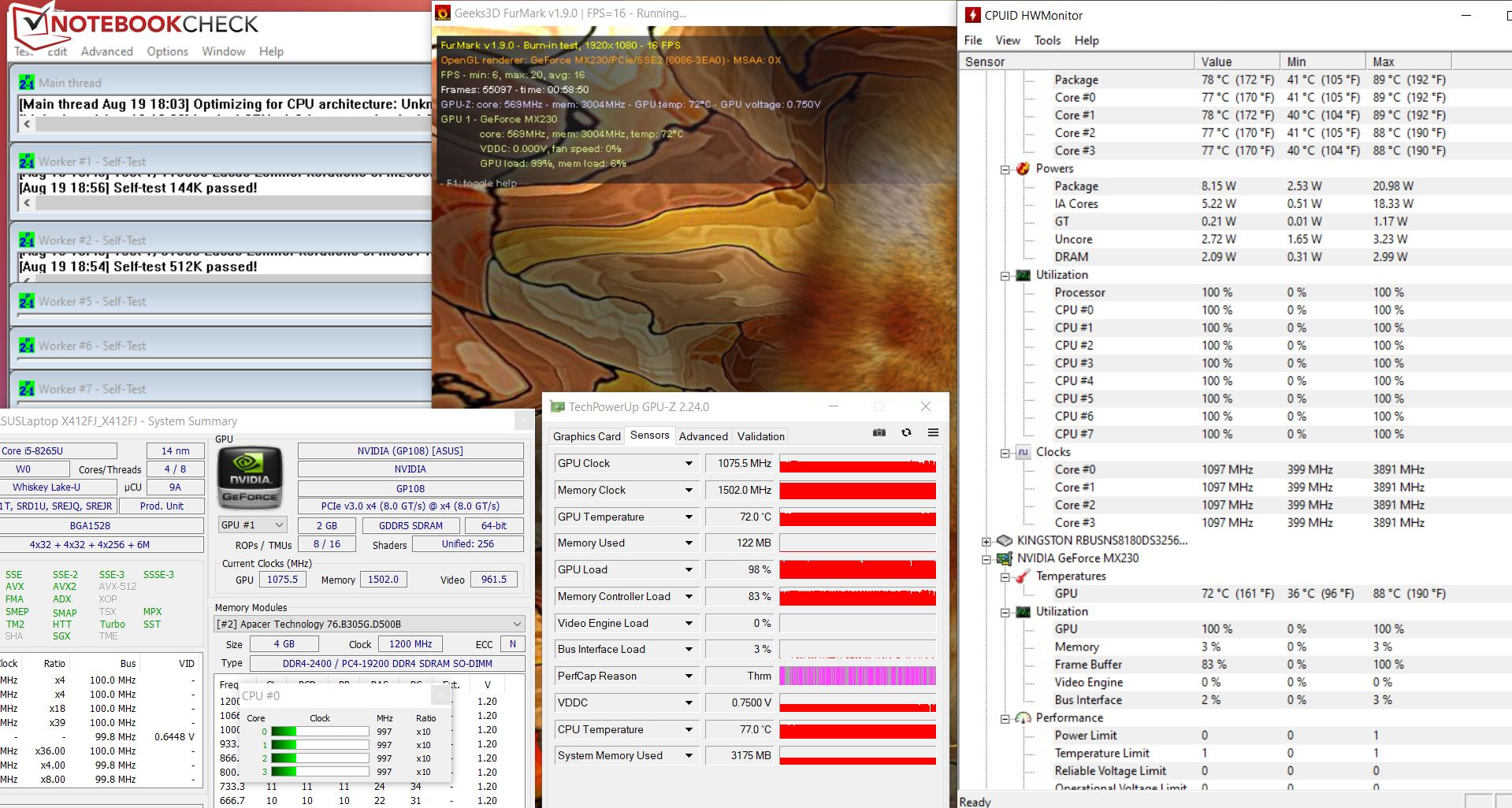 We achieved this maximum fan noise during our stress test, where we ran FurMark and Prime95 simultaneously to see how the system performed under extreme load conditions. CPU and GPU performance in this test depended on whether we had the device connected to the mains, as the system throttles heavily on battery power.