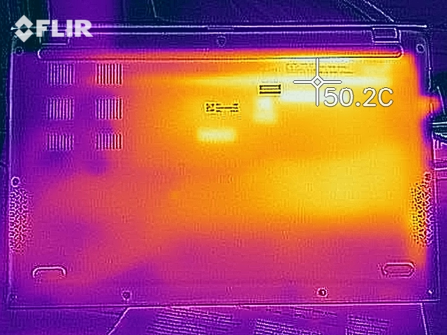 Most of the VivoBook 14 remains pleasantly cool to the touch even under sustained load. A few areas reach 40 °C (104 °F), with one area peaking at 45.2 °C (~113 °F), but most of the device remains below 30 °C (86 °F). Likewise, the device should feel cool to the touch at idle.