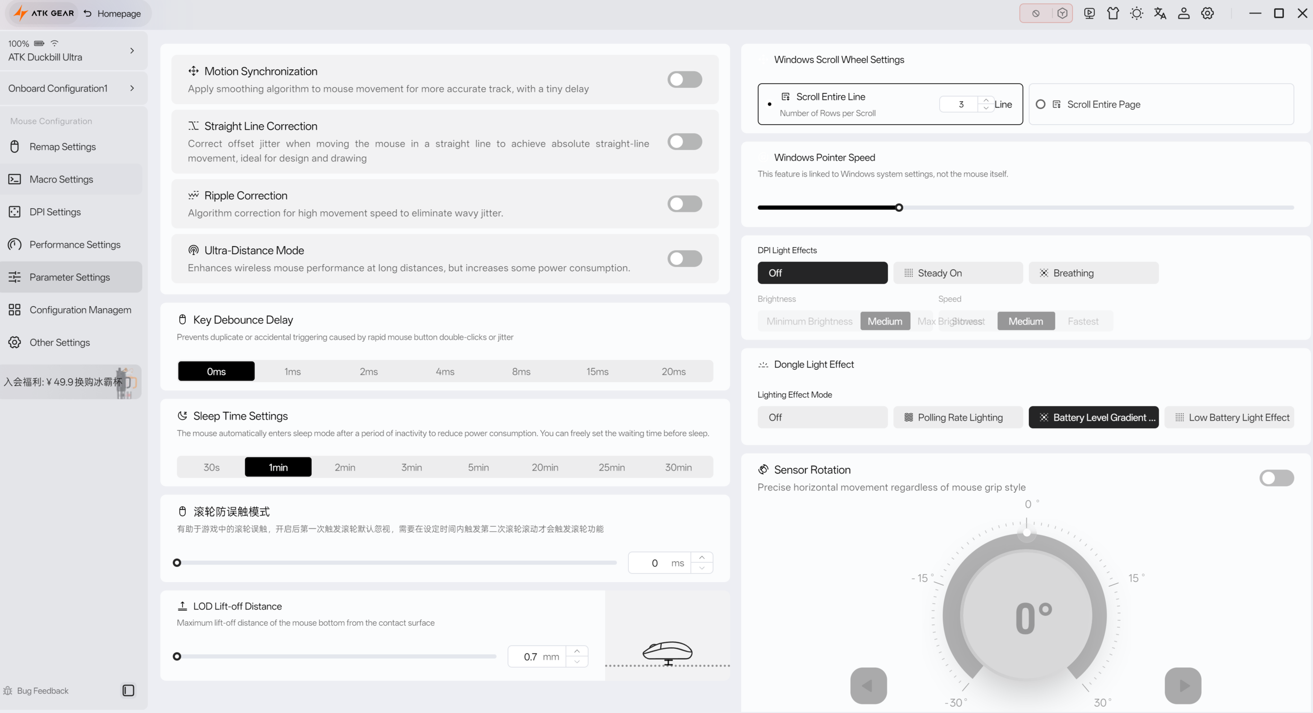 The Blazing Sky Duckbill Ultra can be configured via ATK Hub, which can be run online. An offline client is also available. ATK Hub offers a wide range of customization options. It offers a dizzying amount of customization options, such as the ability to individually set different values for ‘X’ and ‘Y’ DPI, ripple correction, straight line correction, and more.