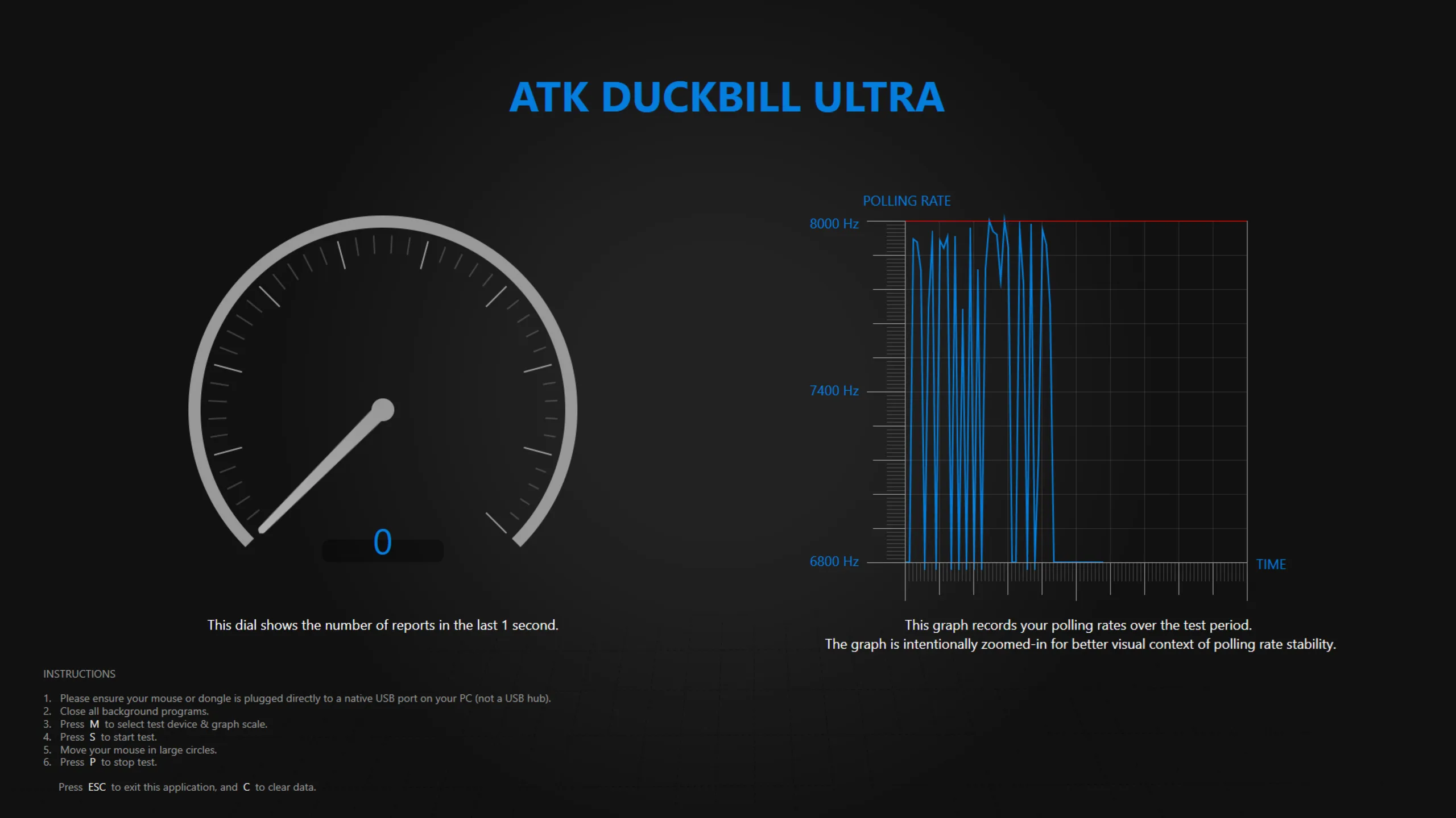 Using Razer’s polling rate measurement tool, we tested if the ATK Duckbill Ultra’s sensor performs as per spec. In wireless mode, the sensor capped at around 7,800 Hz, which is acceptable. Things got a bit interesting in wired mode, though. For a brief moment, the tool showed a reading of above 8,000 Hz. Intriguing, but at the very least, it proves that the mouse works as advertised.
