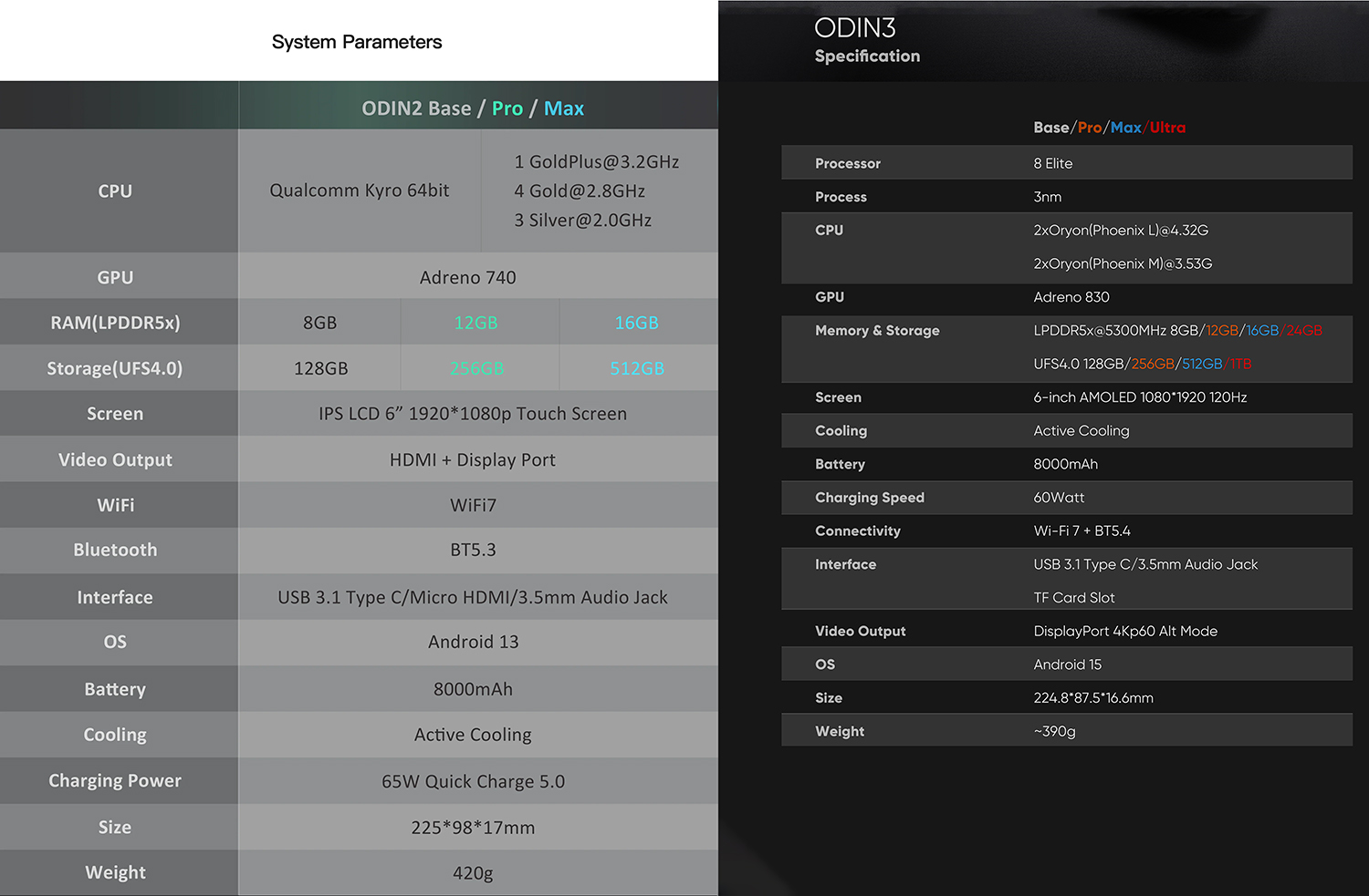 Another key detail that the spec sheet reveals is the configurations that will be available for the AYN Odin 3. There will be four tiers, and each of them will come with the following amount of LPDDR5x RAM and UFS 4.0 storage: