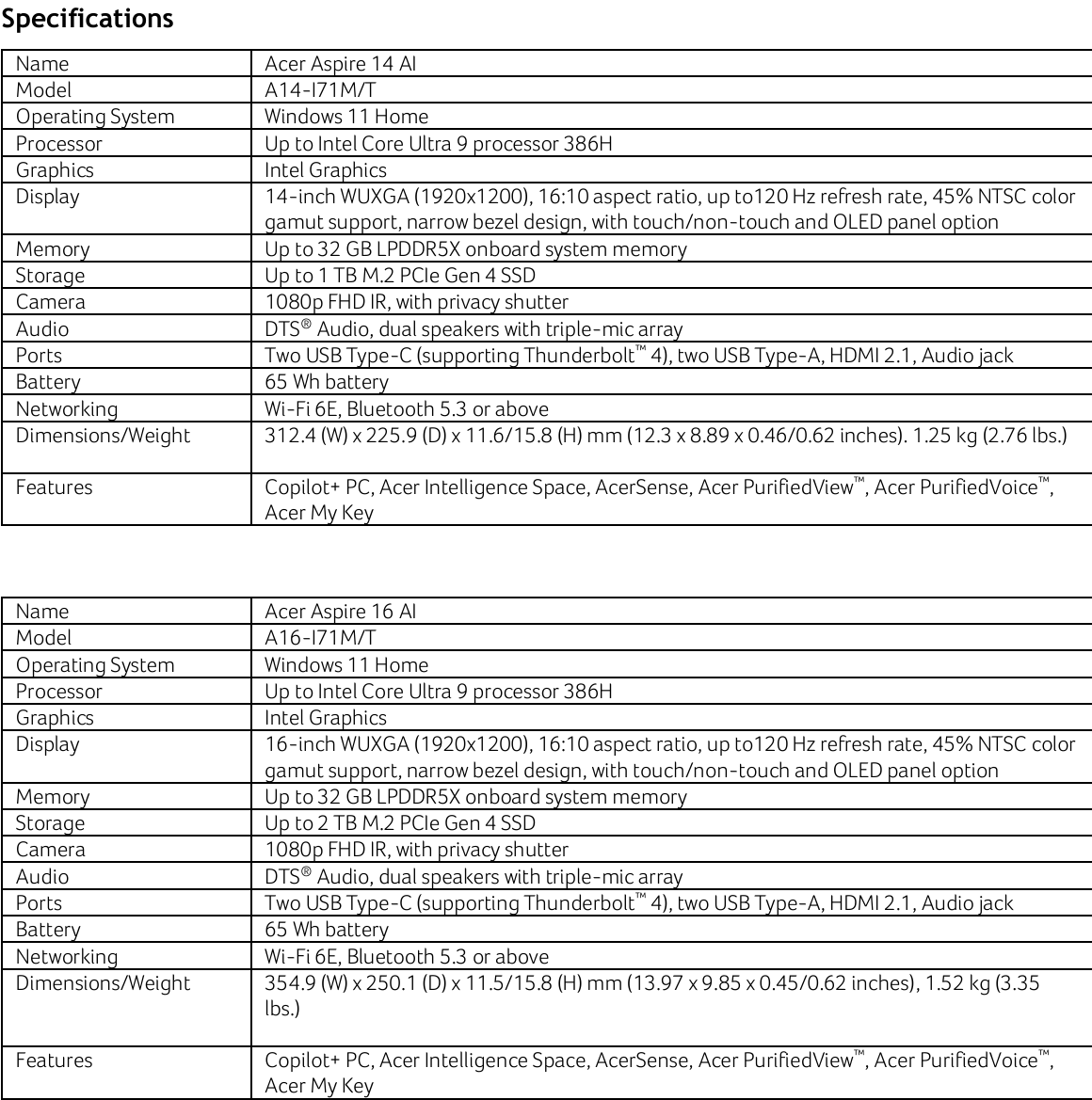 The Aspire 14 AI and Aspire 16 AI are Copilot+ PCs powered by the Intel Core Ultra 9 386H with up to 32 GB of LPDDR5x RAM and up to a 2 TB M.2 NVMe SSD.