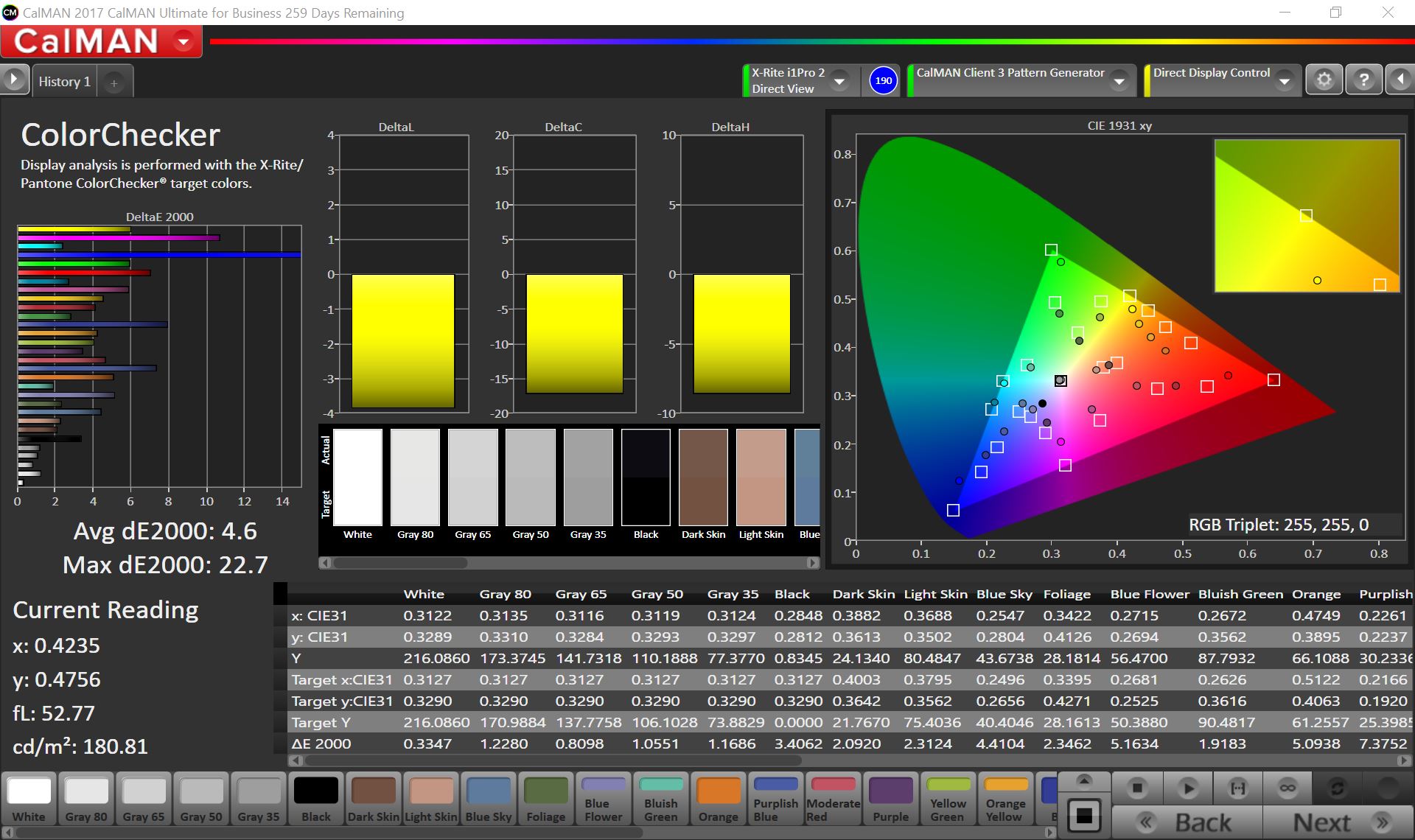 | Greyscale dE 2000 * | 11.6 | 3 74% | 4.26 63% | 12.5 -8% | 5.5 53% | 3.1 73% |