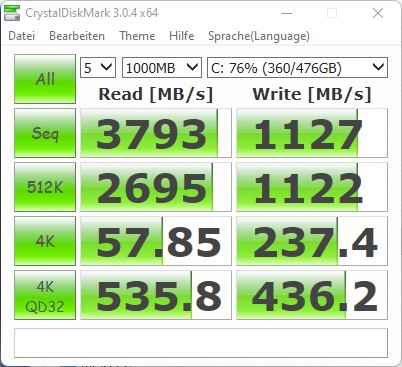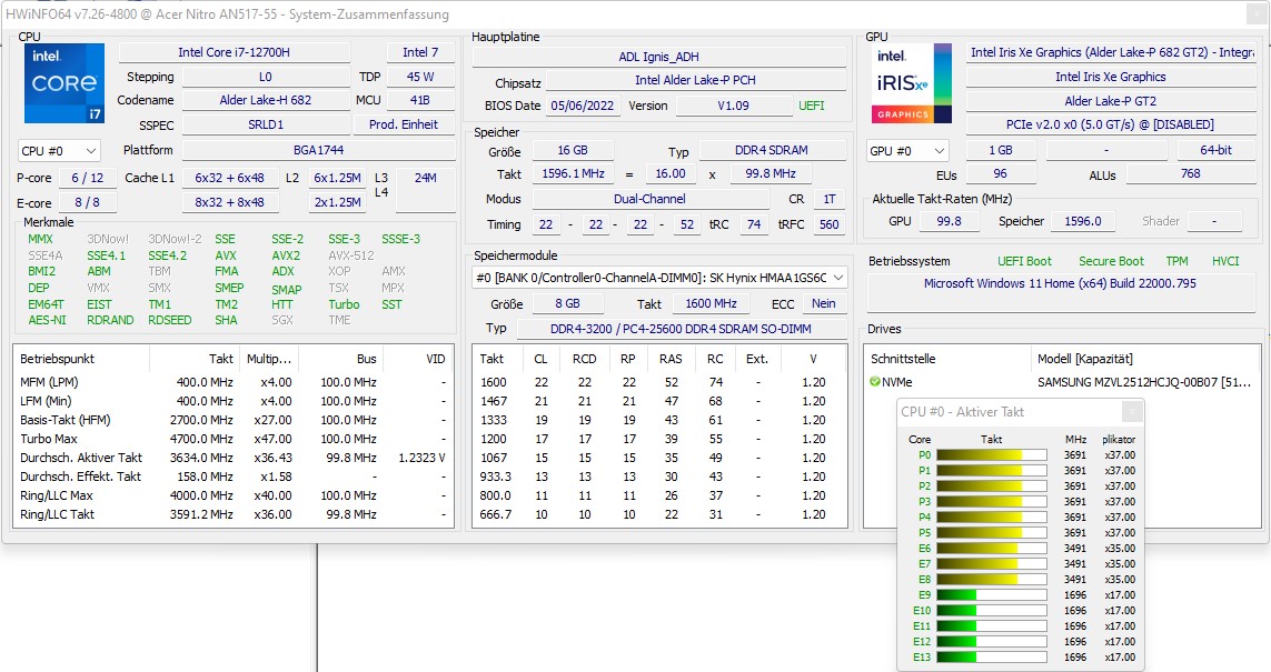 | Acer Nitro 5 AN517-55-738R GeForce RTX 3060 Laptop GPU, i7-12700H, Samsung PM9A1 MZVL2512HCJQ | Lenovo Legion 5 17ACH6H-82JY0003GE GeForce RTX 3060 Laptop GPU, R5 5600H, Samsung PM991a MZALQ512HBLU | Asus TUF Gaming F17 FX707Z-HX011W GeForce RTX 3060 Laptop GPU, i7-12700H, SK Hynix HFM001TD3JX013N | Acer Nitro 5 AN517-41-R5Z7 GeForce RTX 3070 Laptop GPU, R7 5800H, SK Hynix BC711 1TB HFM001TD3JX016N | Schenker XMG Core 17 (Early 2021) GeForce RTX 3060 Laptop GPU, i7-10870H, Samsung SSD 970 EVO Plus 1TB | MSI Katana GF76 11UE GeForce RTX 3060 Laptop GPU, i7-11800H, Kingston OM8PCP3512F-AB | |