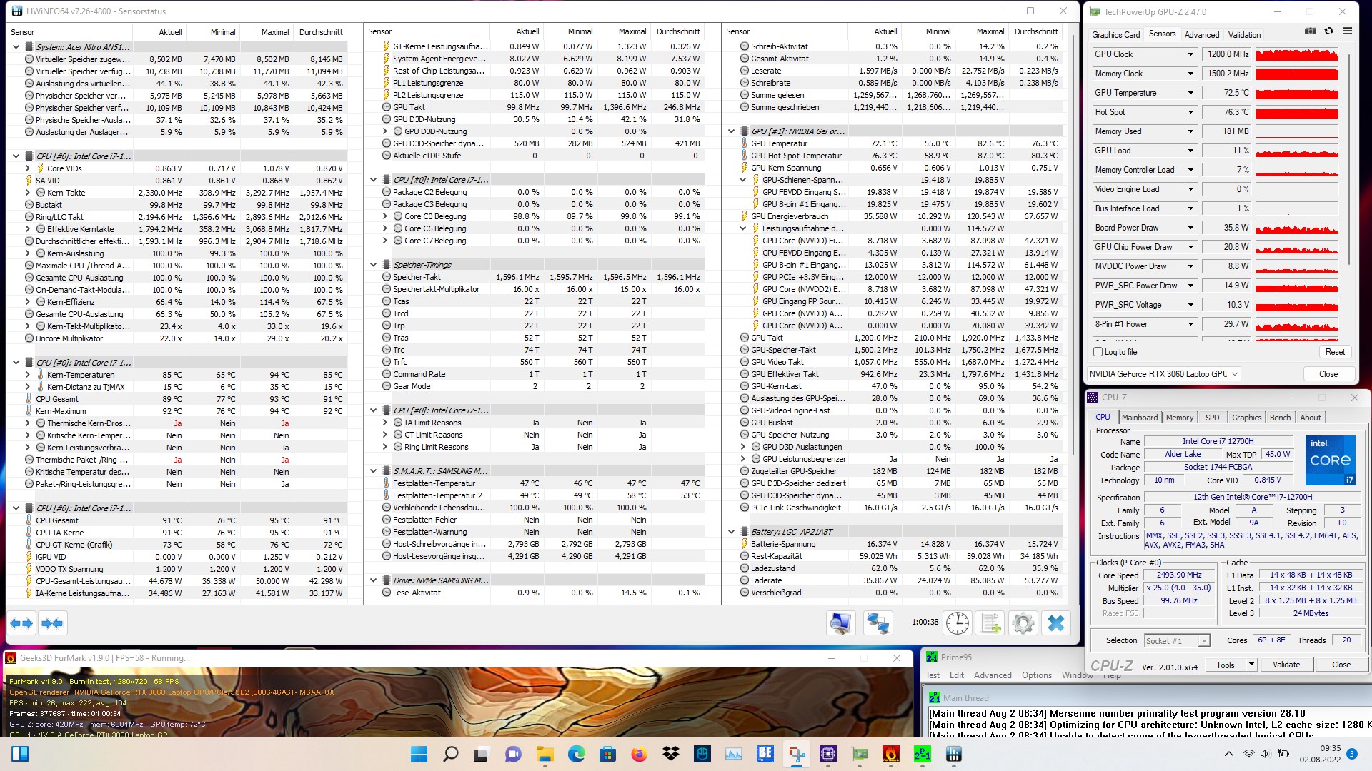 The "Quiet", "Standard" and "Performance" profiles can be selected via the "Nitro Sense" tool. We performed all CPU and GPU tests in the "Standard" profile, since this profile represents the best option in terms of performance and noise emissions. More details on why we chose this can be found in the volume measurements section. The processor's TDP was not restricted, although the cooling sets the limit here. We recorded a maximum power consumption of around 100 watts for the Nvidia GeForce RTX 3060 laptop GPU. This leaves the model a little behind the maximum possible 130 watts.