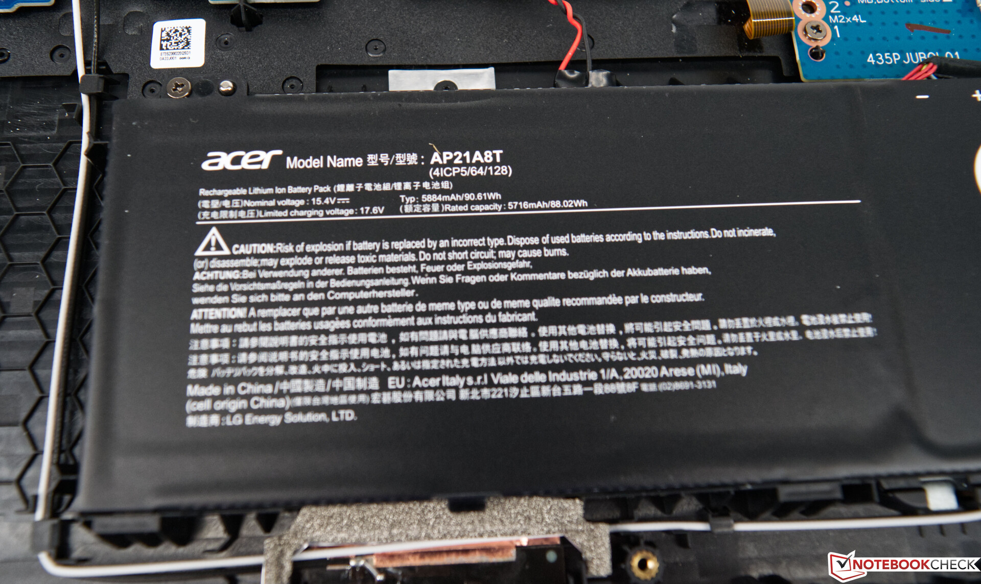 The inbuilt speakers are only conditionally suitable for playing music. Likewise, gaming isn't much fun if you don't use external playback devices. The two speakers are directed downwards and do not offer any bass. Highs and mids clearly predominate. The volume is simply too low to generate better sound. There definitely would have been enough space for better speakers, as can be seen in this picture. Acer could have also easily integrated a small subwoofer. Sufficient space is available inside for this as well, but instead simply remains unused.